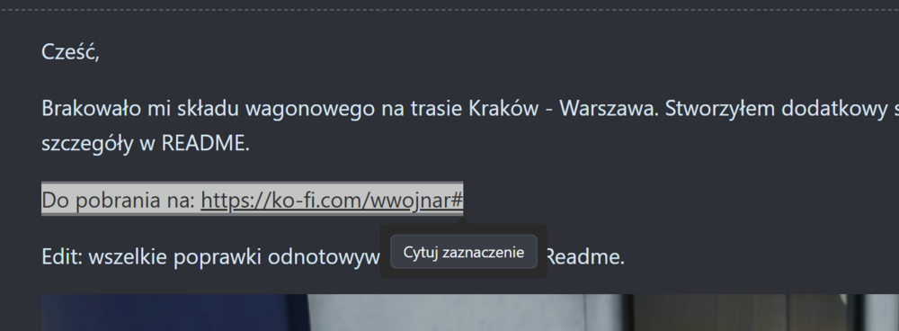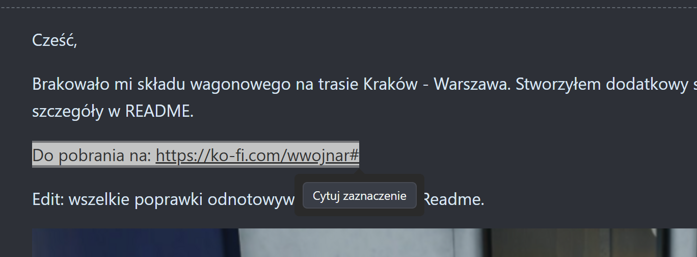 @bart_dem, @eSPeIKaE, przed chwilą skończyłem testowanie zakończenia scenariusza prawie wszystkim, co jest dostępne do wyboru na starcie. Wchodzenie do drugiego ezt po wyjściu na zewnątrz - nie ma znaczenia. Mogę też zostać w kabinie lokomotywy czy w kabinie lub przedziale pasażerskim ezt i siedzieć tam godzinami, dowolnie długo. Ale jeśli tylko wyjdę na zewnątrz, obojętnie czy wstając z fotela i wychodząc przez drzwi - czy zmieniając widok na zewnętrzny (klawiszem 3), to skutek jest zawsze ten sam. Po 15 sekundach scenariusz się kończy: W logu, który zapodał @eSPeIKaE nie widać żadnych błędów scenariusza. Próbowałem na różne sposoby wywołać to, o czym piszecie. Nie udało mi się. Nie wiem co poradzić. Może takie dwa pytania: Czy macie włączoną wersję NEXT? Czy używacie programu SpecialK (lub podobnego) do podmiany tekstur z malowaniami? Jeśli na oba pytania odpowiedź brzmi przecząco, to pozostaje chyba tylko sprawdzić spójność plików, bo coś musi być z nimi nie tak. Ciekawe czy ktoś jeszcze ma problem z zakończeniem scenariusza?