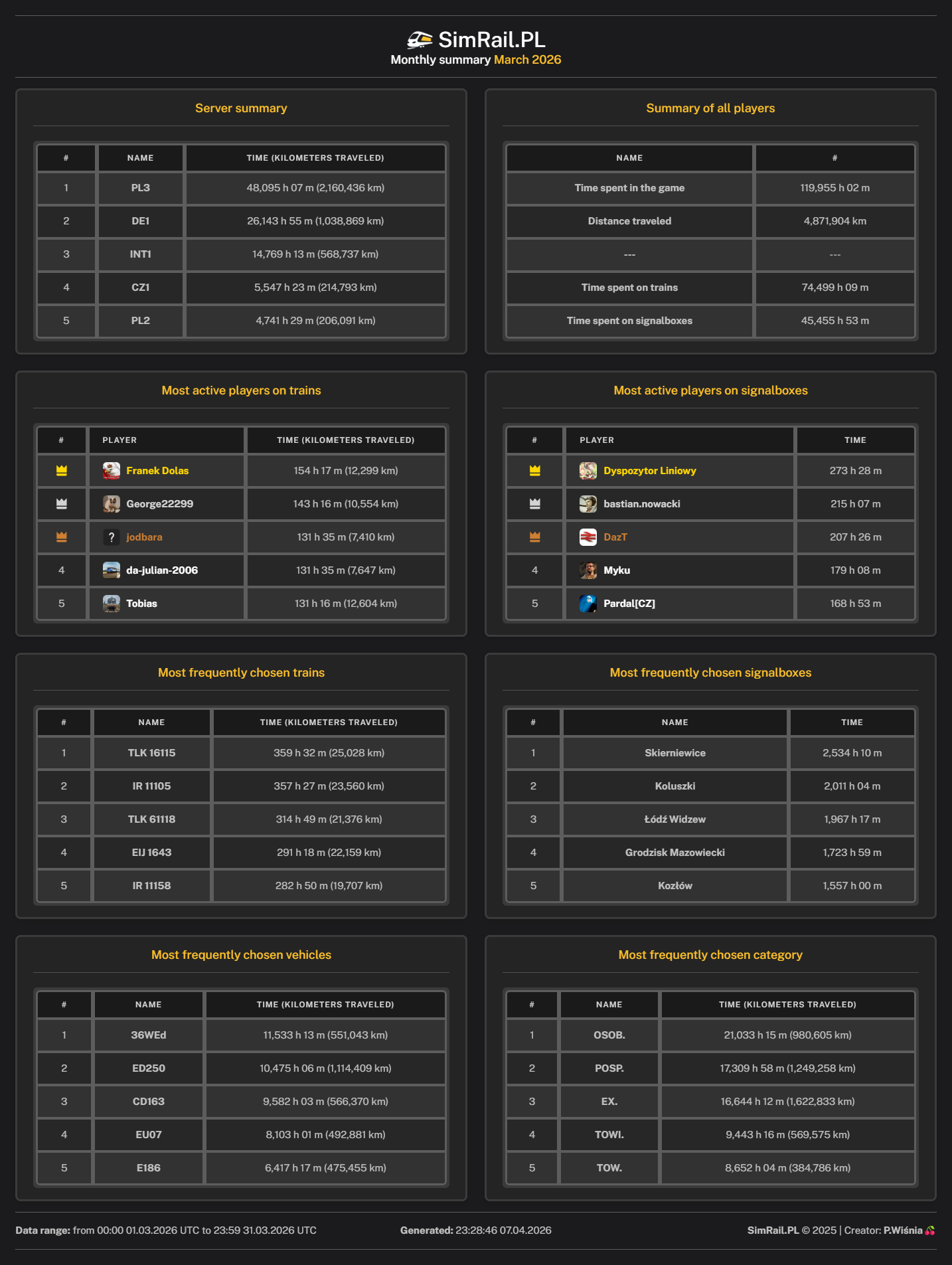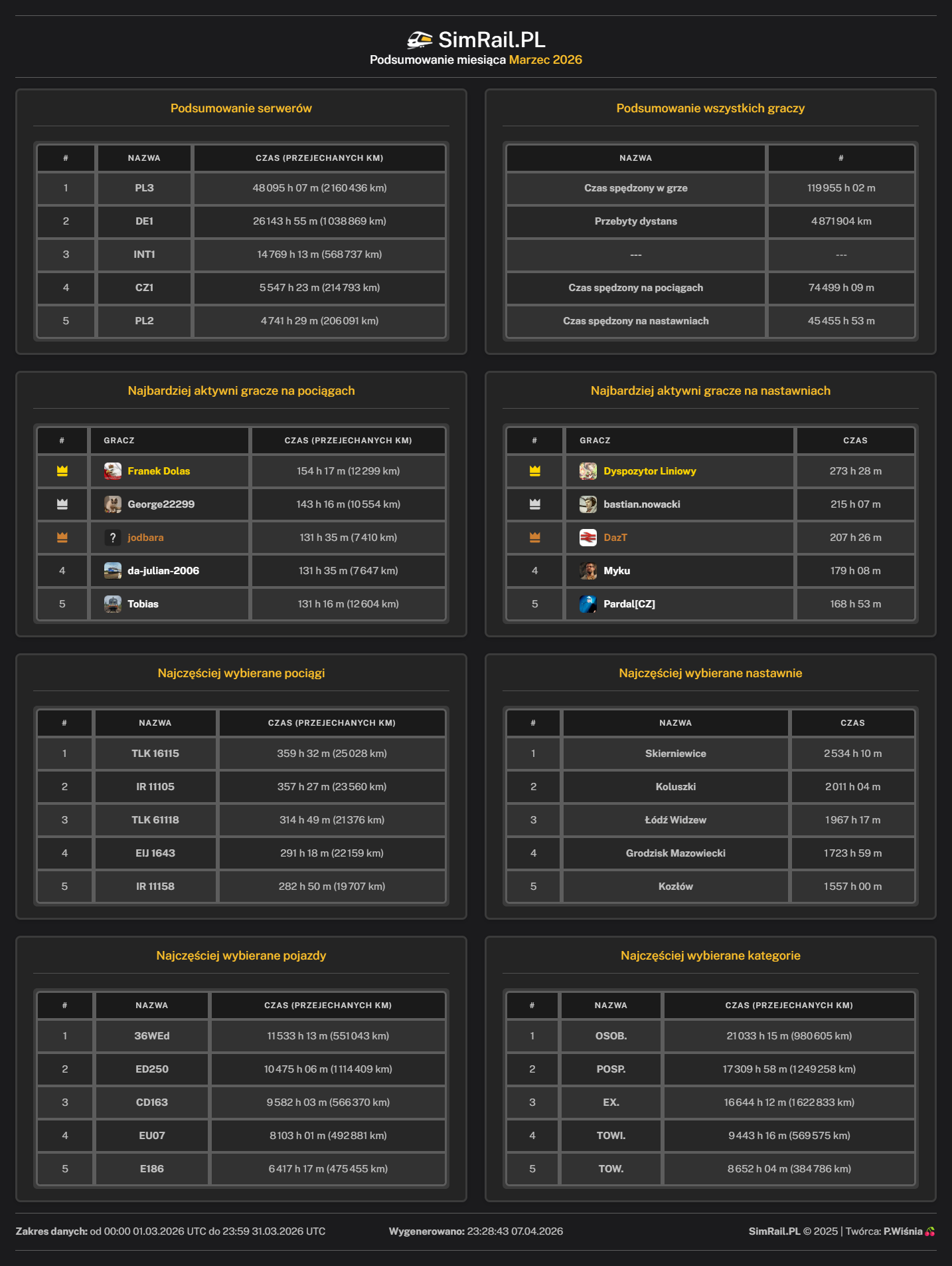Słucham uważnie i odpowiadam. Ten 50 minut wcześniej to na bank 649xxx ewentualnie luzak 455xxx, ale już nie będę się rozpisywał o bzdurnym rozkładzie. Mówisz o którymś posterunku który w końcu wybuchnie. Miałbyś rację gdyby...spełniło się moje marzenie i dostalibyśmy trasę Myszków - Częstochowa - Radomsko - Piotrków Trybunalski. Niestety taka nie istnieje, więc nie ma kto wybuchnąć przez "problem" który stworzyłeś na ŁA. 🙂 edycja: powiem Ci śmieszniejszą rzecz. Wejdź sobie na Zawiercie w nocy. Zobaczysz jak tamtejszy bot "przepycha łokciem" towary do Myszkowa dwoma torami (serio).