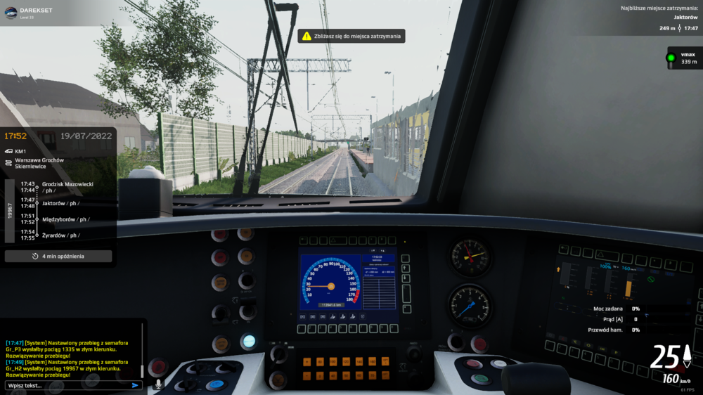 AI jako dyżurny w Grodzisku układa nie poprawne przebiegi dla składów. Zrobił to z semafora Gr_P3 dla pociągu 1335 oraz z semafora Gr_H2 dla pociągu 19967. Nastąpiło oczywiście rozwiązanie przebiegów. Następnie kolejne ułożenie było prawidłowe. Screenshot z pociągu 19967, który prowadziłem.