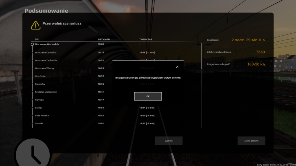 Na PL2 około 20:30 jechałem składem 1437. Dojechałem do stacji Sosnowiec Główny gdzie czekałem na odjazd. Do planowego odjazdu było jeszcze około 1:30 minuty. Miałem podany wyjazd S2 w kierunku Katowic. Nagle nie wiem co było przyczyną, ale scenariusz zakończył się, a na ekranie wyświetlił się komunikat o usunięciu pociągu. Obawiam się że usuwanie pociągów jest zbyt bardzo restrykcyjne Screen oraz log w załączeniu. SimRail_log_2023-02-23_18-01-03.txt