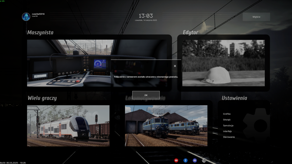 1. Witam, wiem że problem był już poruszany ale nie znalazłem jakoś rozwiązania do niego a mianowicie po wejściu w maszynistę pokazuje się ekran ładowania ale tak przez chwilę nic się nie dzieje po czym wychodzi do głównego Menu i wyskakuje informacja " połączenie z serwerem zostało utracone z nieznanego powodu". Ten sam problem pojawia się u dyżurnego z tym że tam wchodzę do dyżurki ale przez jakiś czas jest wszystko zablokowane i po jakieś chwili mnie wyrzuca i wyświetla ten sam błąd. Jak internet przeżuce na router z telefonu to nie ma żadnego problemu, łącze się maszynista i dyżurką i mogę grać normalnie, z jakiś tydzień temu na domowym internecie też grałem normalnie nie było problemu. Jest jakiś sposób by to naprawić ?