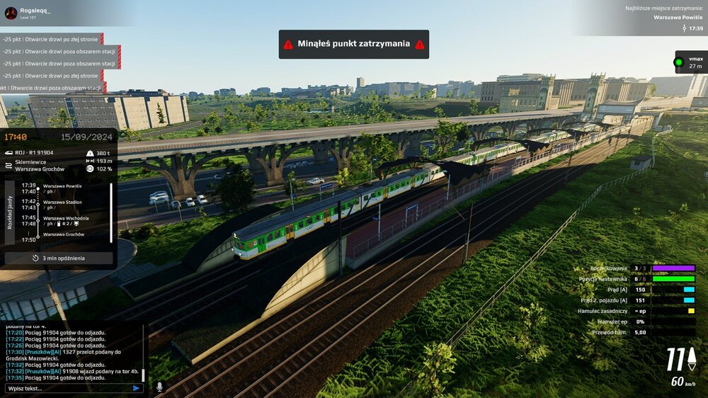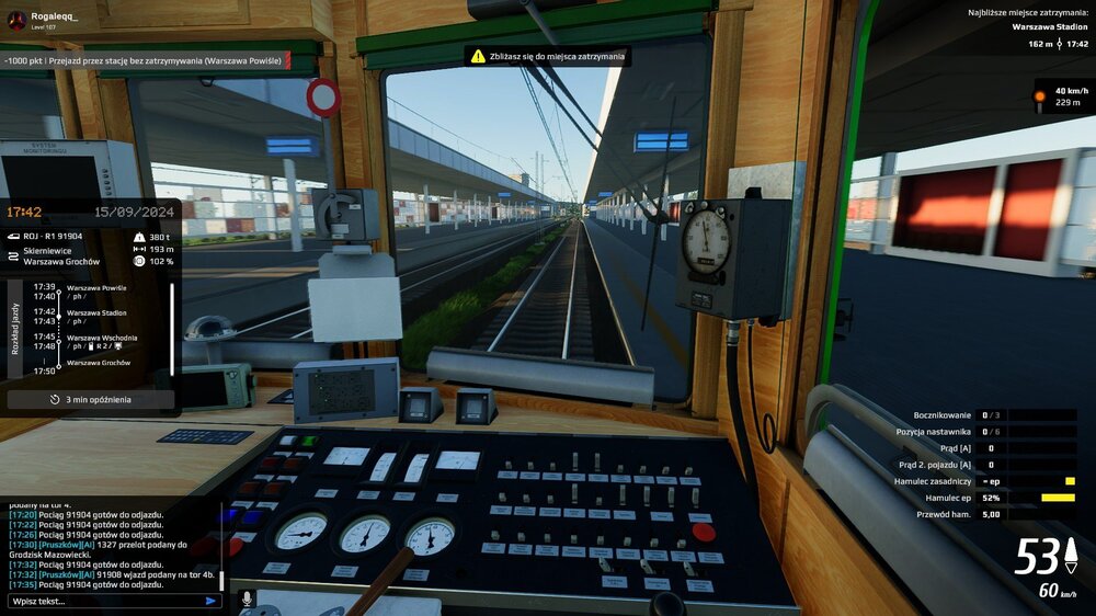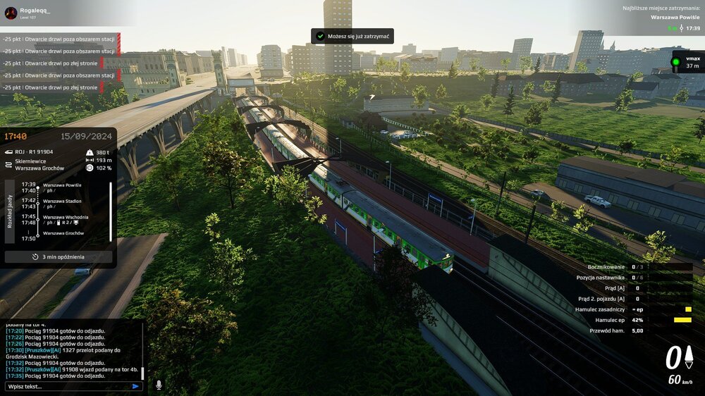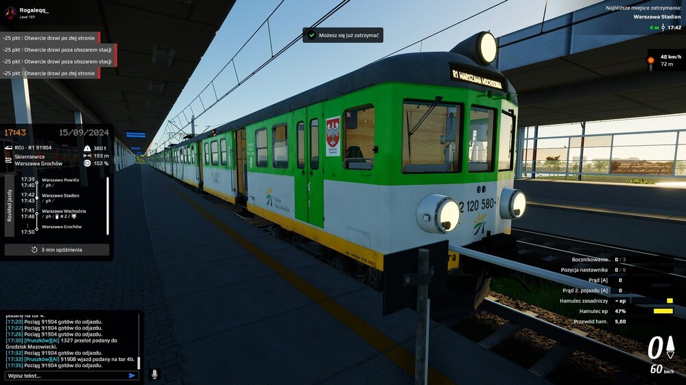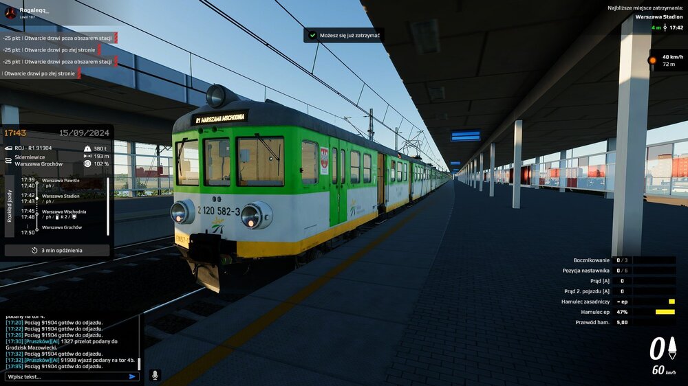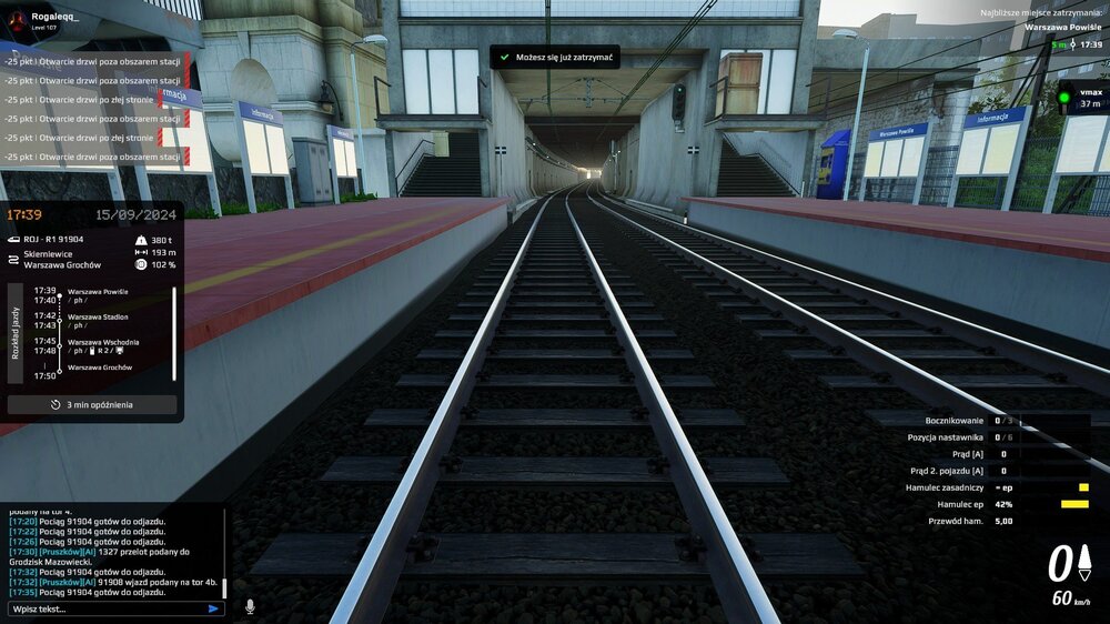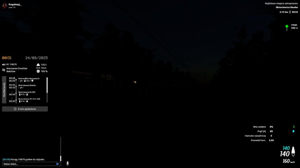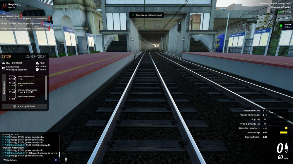 Na serwerze PL8 jadąc EN57 KM ze Skierniewic do Warszawy Wschodniej trasa przebiegała spokojnie. Armagedon się zaczął po wyjeździe z Zachodniej. Zacznijmy od tego, że po Wwa Ochota wcale nie ukazał się w rj, później zaczęły się jeszcze ciekawsze rzeczy. Wjeżdżając w tunel napotkałem na ścianę, na którą najechanie nie spowodowało absolutnie niczego. Jechałem dalej. Po dojeździe do Wwa Powiśle nie zaliczyło zatrzymania się, mimo że zatrzymałem się przed wskaźnikiem W4. W dodatku po otwarciu drzwi ukazał się komunikat o otwarciu drzwi ze złej strony i poza obszarem stacji. Pomimo to ruszyłem dalej kierując się w stronę po Warszawa Stadion. I tutaj sytuacja się powtórzyła. A dodam jako ciekawostkę, że grając około 14 nie dało się wjechać na Ochotę, ponieważ symulator na to nie pozwalał. Log i screenshoty poniżej SimRail_log_2024-12-14_22-46-16.txt
