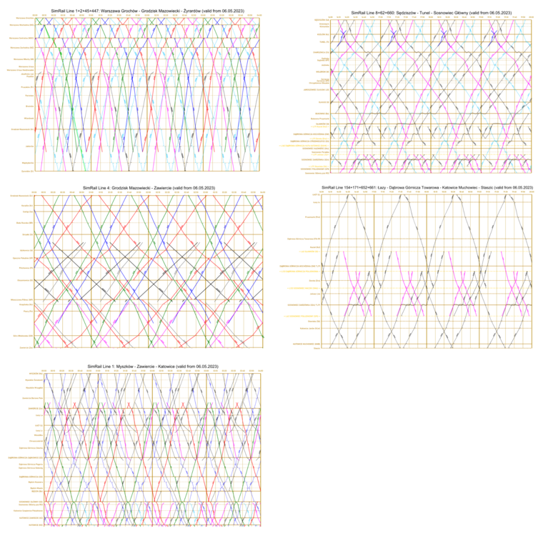 I'd like to share an update of my graphical 24-hour timetable in PDF format, now with much better quality than the previous simplified version. The diagrams were created in the free version of jTrainGraph (https://jtraingraph.de/) and are based on regular train arrival/departure times from the SimRail EDR. You can choose from two available diagram layouts - with horizontal or with vertical time axis. Hopefully I will be able to reflect future changes of SimRail official timetable and keep the diagrams up-to-date. Preview image: PDF diagrams for the sections Warszawa Grochów - Grodzisk Mazowiecki - Żyrardów (lines no. 1, 2, 45 & 447): SimRail_Graphical_Timetable_Line_1a_20230506_horizontal.pdfSimRail_Graphical_Timetable_Line_1a_20230506_vertical.pdf . PDF diagrams for the section Grodzisk Mazowiecki - Zawierce (line no. 4): SimRail_Graphical_Timetable_Line_4_20230506_horizontal.pdfSimRail_Graphical_Timetable_Line_4_20230506_vertical.pdf . PDF diagrams for the section Myszków - Zawierce - Katowice (line no. 1): SimRail_Graphical_Timetable_Line_1b_20230506_horizontal.pdfSimRail_Graphical_Timetable_Line_1b_20230506_vertical.pdf . PDF diagrams for the sections Sędziszów - Tunel - D. Górnicza Wsch. - Sosnowiec Pł. - Sosnowiec Gł. (lines no. 8, 62, 660): SimRail_Graphical_Timetable_Line_62_20230506_horizontal.pdf SimRail_Graphical_Timetable_Line_62_20230506_vertical.pdf . PDF diagrams for the sections Łazy - Kozioł - D. Górnicza Wsch. - Dorota - Katowice Muchowiec - Staszic (lines no. 154, 171, 652, 661): SimRail_Graphical_Timetable_Line_171_20230506_horizontal.pdf SimRail_Graphical_Timetable_Line_171_20230506_vertical.pdf