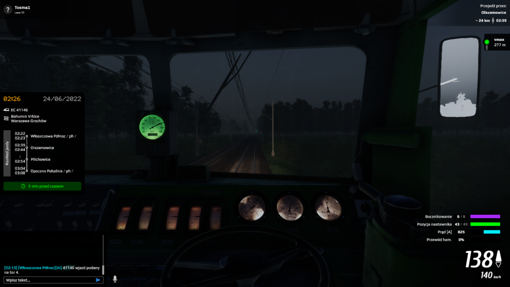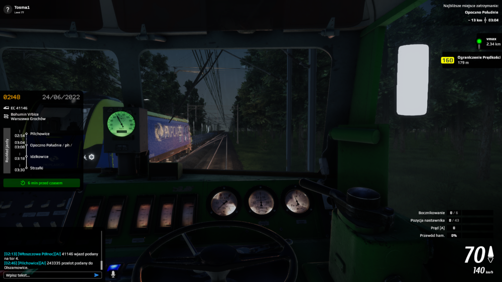 Drobny problem: Stacja Opoczno, przyjeżdżam pociągiem 5 minut przed czasem, zatrzymuje się na stacji tak, że lokomotywa wystaje w 1/3 za peron (trochę przejechałem stację). Po przyjęciu pasażerów / info od kierownika, że można odjeżdżać, ruszam zgodnie z rozkładem jednak gra wyświetla info "Zabierz pasażerów z Opoczno Południe) i odwrotnie odlicza kilometry. Sytuacja naprawia się po przejechaniu kolejnego posterunku.