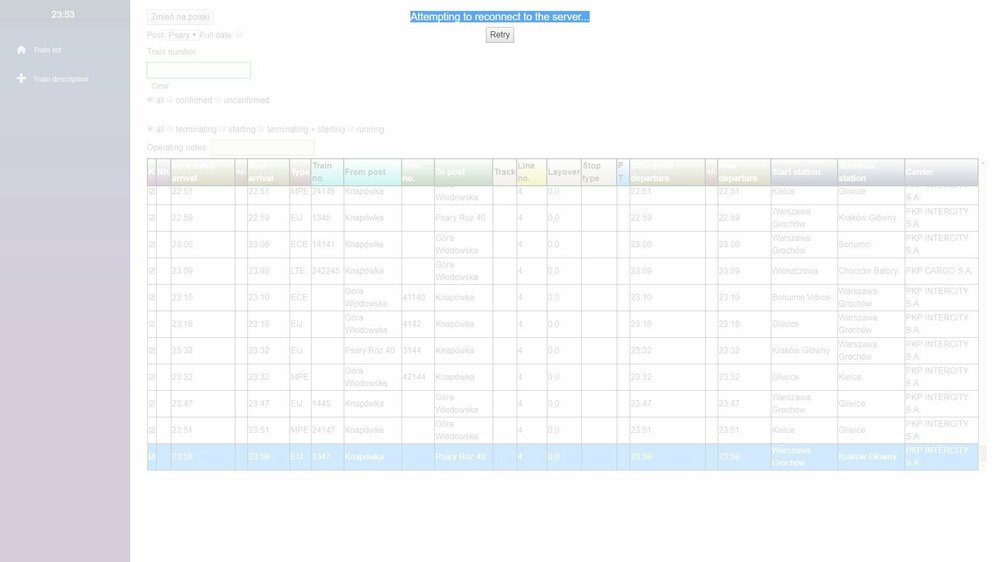 For some reason, timetable monitor glitched and it started "Attempting to reconnect to the server..."-thing, which failed and "Retry" button doesn't do anything. Rejoining to the same station makes it go away, but timetable becomes empty and I have no idea about destination of trains. Station of occurence is Psary, but as far as I can see Im not the only one with this problem, dispatcher from Gora has the same thing. Logs.zip