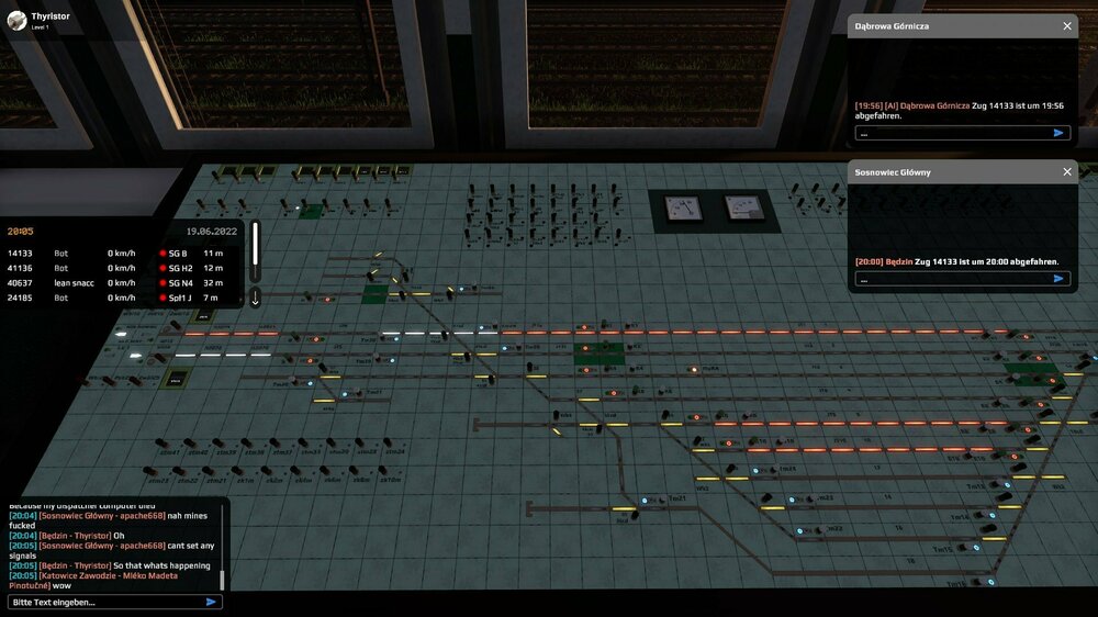 Hello again, I've played some more as a train driver and now I've compiled a list of bugs 1. I've stumbled upon a situtaion, where I was desyncronised with dispatcher, probably. I was driving through Sosnowice and I had a clear track ahead and suddenly the signal infront of me (as far as I remember it was H2) turned red and I couldn't proceed, obviously. The dispatcher there claimed, that it was green and I could proceed it. I tried to pass it, but probably because it was red, game teleported me back in front of this signal. Can't really provide any evidence about it, only that it occured on DE2 server. 2. When I click on a train from the list where you pick the mission while joining the server, there is a high chance, that once you just click on the name to check an info about the route and train it immediatly starts the game, which can be annoying, especially when you don't know the type of train the mission provides. 3. Loco brake handle is glitching when you try to turn it with a mouse: when you pull it, it constantly chagnes value between current value and 100% (like being in superposition). Its not that critical, but still. 4. This one is confusing, because I don't know if it should be like that or not, but I'll still write that down: while driving EP07 and switching throttle positions, the ampermeter on GUI is showing the same current as in cab, but only until you switch to parallel motor connection after 21st or 22nd position. Then GUI shows the sum of currents from both of ampermeters and at this point I don't know if it is intended to be like that (I get that its like a sum of currents from both of group of engines) but it might be confusing sometimes. 5. Playermodel of the driver is outside of the cab. Don't know how it happened. 6. It seems that I missed the sign, where it says to switch to other radio channel, now the game takes away my points for being on the wrong channel, however it doesn't tell me, which one is correct. I suppose, it should. 7. I guess there should be a proper message instead of placeholder. 8. The tooltips show that the switches are in off position, however they are enables as a model and as an equipment on the train. It happened occasionally and soon fixed itself (probably after I made a stop at a platform). 9. Small UI glitch while I tried a dispatcher role.