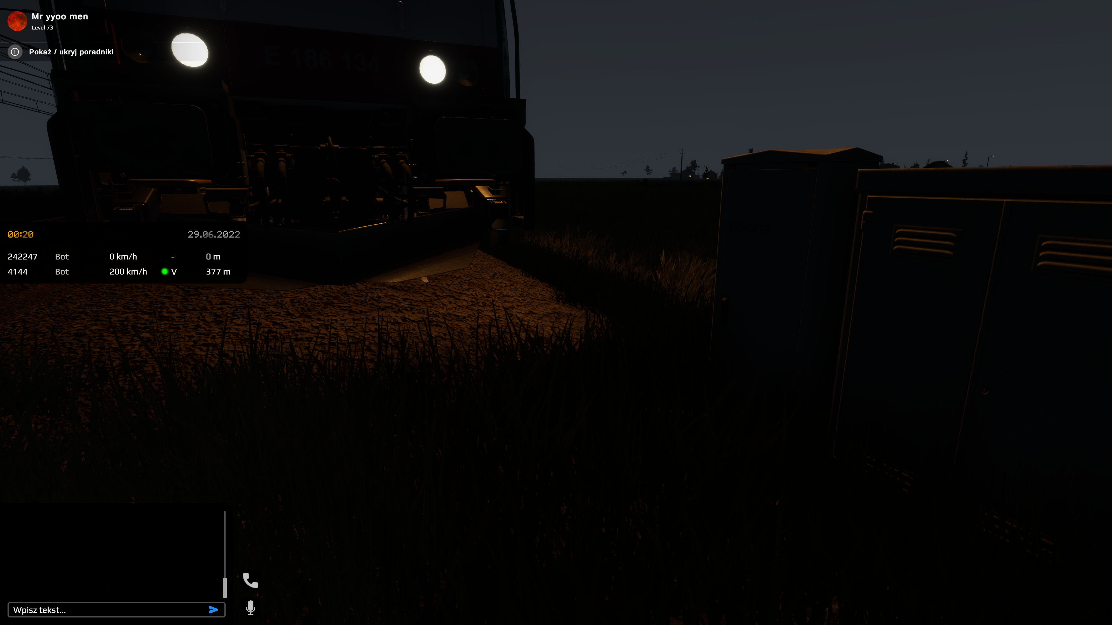 Dzisiaj w godzinach nocnych prowadzilem testy i w Psarach ( siedzialem jako dyzurny w nastawni ) udalo mi sie wykoleic Traxx'a . Po wykolejeniu oczywiscie sama lokomotywa  stala sie nie grywalna. Sprawdzilem to po prostu logujac sie do niej. Po zalogowaniu z automatu wyskakuje komunikat o wykolejeniu, w zasadzie normalna sytuacja, lecz nawet po opuszczeniu serwera , zagraniem innym skladem , wroceniem  na Psary po okolo moze godzinie lokomotywa dalej stala i byla nie grywalna. Z tego co mi wiadomo sklad po wykolejeniu jest automatycznie kasowany.