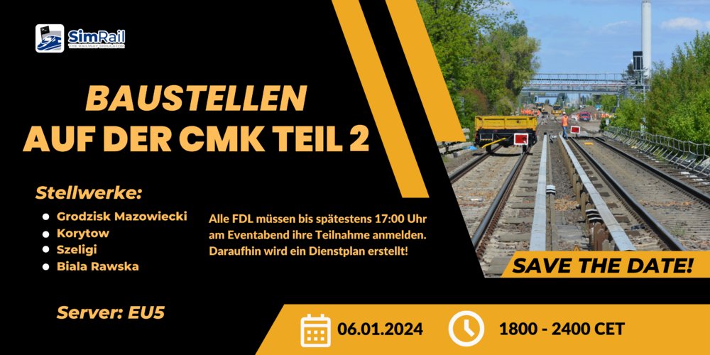 Teil 2 der Serie rund um Baustellen auf der CMK, welche am Ende in einem Großevent enden soll. Die Anzahl der Events ist noch nicht bestimmt und hängt von der Beteiligung an FDL und Triebwagenführern ab. Bei diesem Teil gehen wir auf die Verbindung zwischen Szeligi und Korytow mit einer Baustelle auf der freien Strecke. Mehr dazu nun in diesem Beitrag. ------------------ Zwischen Szeligi und Korytow wird auf der freien Strecke gearbeitet. Mit einer Wanderbaustelle wird zuerst das Grünzeug entlang der Strecke zurück geschnitten und der folgende Bauzug ersetzt einzelne Gleisschwellen. Hierzu wird für 6 Stunden Gleis 2 zwischen den beiden Stellwerken komplett gesperrt. Zusätzlich kommt es in Korytow zwischen der Baustelle (Einfahrtsignal Z) und dem Versorgungsbereich links von Gleis 3 zu Unterbrechungen, wenn neues Material nachgefasst werden muss. Problemstellung - Gleis 2 zwischen Signal Z (Korytow) und Signal B (Szeligi) ist während dieses Events durchgehend gesperrt. - Für Rangierfahrten und um Material für die Baustelle nachzufassen, werden die Bereiche rund um die Weichen 21,22,23,25,27 und 28 sowie in seltenen Fällen Weiche 24/26 temporär gesperrt. Beteiligte Stellwerke Grodzisk Mazowiecki Korytow Szeligi Biala Rawska Bedingungen für Fahrdienstleiter Alle FDL der beteiligten Stellwerken haben den ingame Voice zu benutzen für die Kommunikation mit den Triebwagenführern. Für dieses Event nutzen wir den Simrail DACH Community Discord, jeder FDL hat sich dort spätestens 10 Minuten vor seiner geplanten Schicht einzufinden. FDL, die sich entgegen der Einteilung auf den 4 oben genannten Positionen einloggen, werden von einem Admin vom Server geworfen. Wer bei dem Event als FDL teilnehmen möchte, hat sich bis zum 06.01.24 um spätestens 17:00 Uhr Auf dem DACH Discord im Channel #event-anmeldungen einzutragen. Daraufhin werden alle angemeldeten FDL notiert und um kurz nach 17 Uhr am Event Tag auf die Positionen verteilt. Die Tabelle dazu, wird am Event Tag rechtzeitig veröffentlicht. Um es etwas fairer für alle zu gestallten, wird es pro STW jeweils 4x 1,5 Stunden Schichten geben. Was auch bedeutet, dass wir nur die ersten 16 Anmeldungen zum Event akzeptieren werden. Alle weiteren kommen auf eine Warteliste und werden (sofern online) als Nachrücker kurzfristig eingeteilt. Für die Triebwagenführer Ihr seid herzlich willkommen! Es ist keine Anmeldung notwendig. Durch die Erfahrung der letzten beiden Events, ist es zu empfehlen, schon früh (aus Süden -2 Stunden und aus dem Norden -1 Stunde) sich einen Zug zu suchen der im Eventgebiet vorbei kommt. Beim letzten Event waren über das ganze Event die Züge vergriffen. Sollte das wieder passieren, gibt es für uns die Möglichkeit, Züge nachträglich zu spawnen. Diese sind dann über das Auswahlmenü ganz normal auszuwählen. DACH Discord Server: EU5