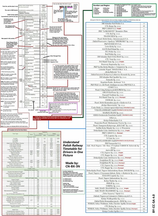 This picture just simply tells everything(kind of) on the driver timetable. However, I'm not a Polish, so there may be some mistakes. If you find anything wrong, just reply this post and I'll fix it as soon as I check it. This guide is suitable for: -People who feel confused about the train number system in Poland -Everybody who would like to make their own scenarios, and want to attach a paper-liked timetable in the description -Everyone interested in the train number system in Poland WARNING: DO NOT try to memorize everything, use it as a dictionary. -Version 2.0 Imgur link: yhah31V.jpeg (2300×3140) (imgur.com) Full list for company code: Strony stale WRJ (readgur.com)[PL only] Special thanks to @robert357 for pointing out the mistakes and giving more detailed information.