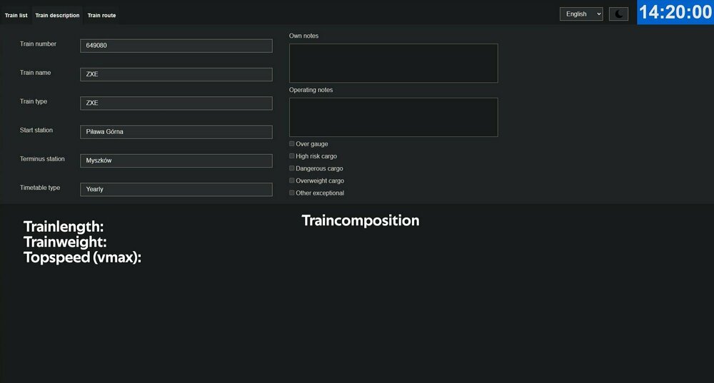 There is no "Vmax" under the "Train route" section. And still, i would like to have a quick overview about the train and its characteristics. The process of comparing different arrival and departure times is taking time. In some situations you just dont have that time if you don´t give trains unnecessary delay times. The best example for decision making where this info would be good is the 1460xx trains. A lot of players are confusing it with freight train and are therefore stoping the train to let a slower train like 141xx pass it. If there would be a clear indication about vmax that consusion could be resolved. -