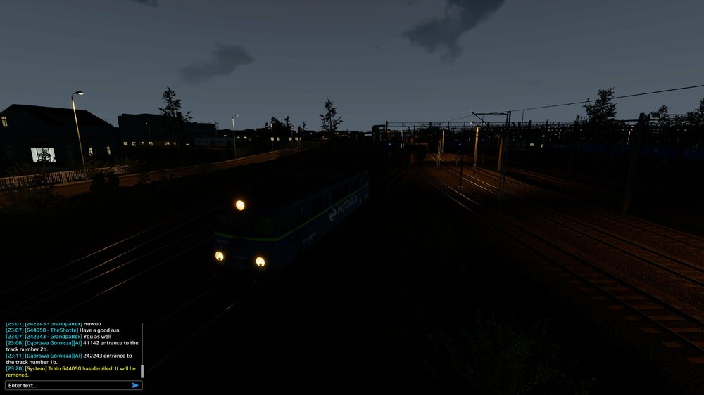 25. So this is post the 18.12.22 update. I was driving yesterday night, super distracted, alt-tabbing and whatnot, and I failed to notice a speed limit drop to 40 km/h. As soon, as I got into the 40 zone (start of a yard), my train went over a switch and it felt like it hopped off the tracks, which is fine cause I was doing a 120 in a 40 zone. I apologize for the dark screenshots, but unfortunately it was nighttime. Now, I have accidentally crashed before. As soon as I did, the server terminated my scenario and essentially booted me to the main menu. I can only assume that following that, my locomotive was deleted in the server. Yesterday? Nothing. No boot from server, no loco deletion. I had to hit Esc, and select "Return to the Menu" to back out of the game.