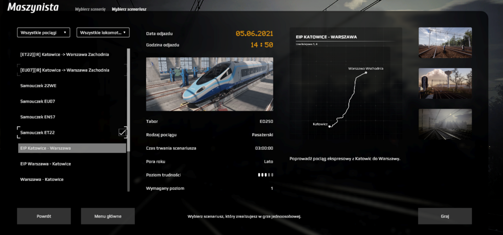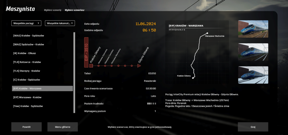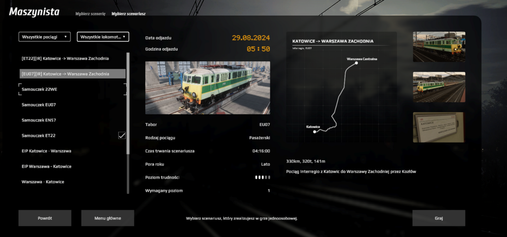 Ponawiam pytanie sprzed kilku miesięcy. Myślałem, że po wyjściu z EA zostanie to poprawione, ale jak widać nie zostało. Obecnie w grze bardzo mocno widać, że była ona robiona etapami. Każdy nowy scenariusz przynosi ze sobą coś nowego. W ostatnim update znów zaszła zmiana w menu - pokazana niżej. W miejscu, gdzie kiedyś był obrazek lokomotywy, teraz jest rozkład pociągu. W prawym dolnym rogu jest informacja o tym, jaki jest to pociąg i jakiej relacji, jaka trasa, jaka pora dnia i jaką pogodę można wybrać. Jest to dobry opis scenariusza. Jednak sprawa wygląda inaczej tutaj: ( obrazek ED250 zamiast rozkładu, w prawym dolnym jest tylko tekst "Poprowadź pociąg ekspresowy z Katowic do Warszawy." Gdzie informacja o trasie, rodzaju pociągu, porze dnia czy pogodzie?) A tutaj jeszcze inaczej: (podana jest długość trasy, waga pociągu, długość, gdzie reszta informacji?) Ponadto warto pomyśleć nad ujednoliceniem nie tylko opisu scenariusza, ale także wyświetlania tych scenariuszy pokolei: (obecnie raz jest nazwa składu, potem trasa i odwrotnie itd.) Najlepszą opcją byłoby to, aby gracz sam mógłby stworzyć tak jak się mu podoba - wybrać wagony, lokomotywę(lub ezt), porę dnia i roku, trasę, ale wiem, że raczej jest to awykonalne.