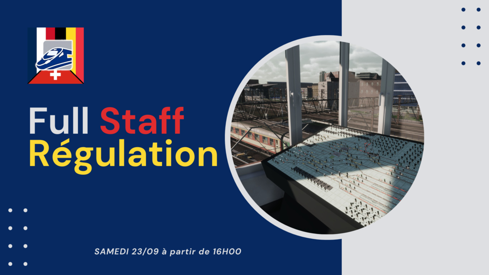 **SimRail Full Staff Régulation - Événement Spécial** **Samedi 23/09 à partir de 16h00** @everyone :flag_fr: :flag_ch: :flag_be: Chers passionnés du rail, :simrail~1: Nous vous invitons cordialement à notre événement **FR CH BE** pour un évènement Full Staff Régulation, Nous sommes déterminés à remplir le serveur au maximum pour que nous puissions profiter d'une communication fluide entre les aiguilleurs et les conducteurs, créant ainsi une expérience de jeu mémorable. Rejoignez-nous pour un voyage inoubliable à travers les voies ferrées de la ligne 1 puis de la CMK. :TrainE186: 🚆 Au programme : Des défis passionnants de régulation ferroviaire. La coordination de trains à grande vitesse, de fret et de passagers. Faire rouler les trains dans leurs sillons respectifs Nous attendons avec impatience votre participation pour faire de cet événement une expérience de simulation inoubliable ! :asd: Pour plus de renseignements poser vos questions ou informer de votre présence si vous le souhaitez dans #💥|events ❤️