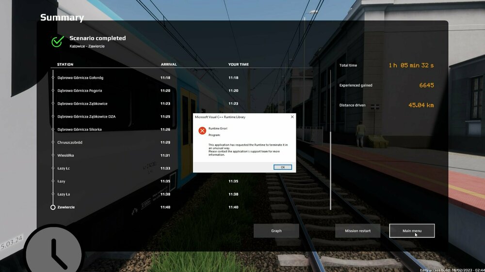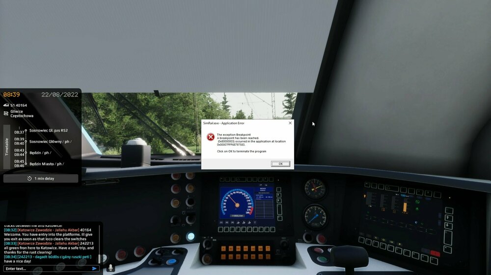 I was doing a high speed train run 4110 from Katowice to Warsaw. I approached Włoszczowa Północ, which was operateed by a human, and was routed to pull into track 4, platform 1 and stopped just 1 meter away from the platform marker. I opened the doors to pickup/drop off passengers at that station and received a countdown timer as normal. Once the human dispatcher gave me the signal to proceed out of the station and I moved forward, the sim told me that "you passed the breakpoint," which I never did. I then abandoned the run and returned to it right away to see if the issue resets, but the issue that I never stopped at WP remained. After reaching Olszamowice, the sim told me that I skipped WP and lost 1,000 points.
