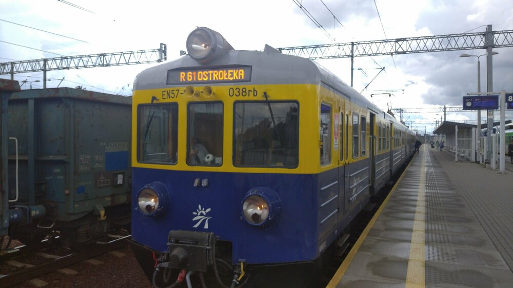 3. Jeździł jeszcze w zeszłym roku taki pociąg os. R61 Warszawa Zachodnia - [średnica podmiejska] - Warszawa Wschodnia - Warszawa Rembertów ... Zielonka ... Wołomin ... Tłuszcz ... Wyszków ... Ostrołęka ale na 2x EN57AL Kolei Mazowieckich, bo do Tłuszcza trasowany na 120 km/h - to może od razu z grubej rury... Babcia spędza emeryturę na takiej, a nie innej linii, bo tam prędkości są rzędu 60-80 w porywach, ale jechałem właśnie EN57-038 w Dniu Bez Samochodu, 22.09.2022, właśnie z Tłuszcza do Ostrołęki (i z powrotem, bo jak niby inaczej) i jestem szczerze zawiedziony - telepią się jakieś blachy, jakby je przykręcono na jeden wkręt z czterech, wszystko skrzypi, trzeszczy i grzechocze, nie domykają się drzwi międzywagonowe, nie zamykają się drzwi przedziałowe - nie tak powinien działać i zachowywać się dopieszczony i zadbany "eksponat-perełka" przewoźnika w specjalnie skomponowanym malowaniu, nawiązującym do historycznego/fabrycznego. Widoczna całkiem niechcący na filmie "Sekcja Tłuszcz" Kolei Mazowieckich, odpowiedzialna za ten "zabytek", powinna się wstydzić tego filmu poniżej - ta jednostka, to w dniu 22.09.2022 najgorsza, rozklekotana ruina spośród wszystkich klasycznych EN57, jakimi jechałem w ciągu poprzednich 20 lat (ze starymi kiblami SKM Warszawa wypożyczonymi z Trójmiasta włącznie)! Już wczesnoporanny (~3:30) osobowy z Poznania Gł. do Kutna na dwóch starych, brudnych i śmierdzących kiblach "jednego" PKP (oczywiście żółto-niebieskich) z lok. Poznań Franowo, piłujący w 1992 110 przy szlakowej 140, brzmiał lepiej, niż to coś tutaj. Musiałem uciec z silnikowego do czołowego (rb w tym przypadku), bo słychać było wszystko to, co na filmie, tylko nie silniki trakcyjne i zapowiedzi (Babcia jest wyposażona we współczesną informację pasażerską i europejskie systemy bezpieczeństwa montowane z powodu norm europejskich nawet w klasycznych EN57, jak blokada drzwi od 5km/h). 2022.09.22 - 12:58:32, st. Tłuszcz 2022.09.22 - 14:27:08, st. Ostrołęka
