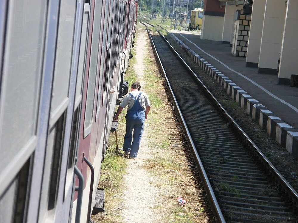 During my travels in Romania from Bihor to Constansa when i was young I recall in some of the major stations, the train started small and then more wagons were added to it but also one particular practice i recall was that i heard a hammer beeing tapped against the wheel? So what's the theory behind it? There is a job of a Wheeltapper. A wheeltapper is a railway worker employed to check the structural integrity of train wheels and that axle boxes are not overheating. Hammering of metals to identify internal flaws, by observing the different types of emitted sounds, is a very rudimentary method. In Simrail, the feature would add a "wheel tapper" where if the train is at the station for more than 1 minute, he would do a random inspection, you would hear him tapping at random carriges and maybe see him do it as well. What do the images explain? The red locomotive: A wheeltapper signing off after checking the wheels of a train at Budapest-Keleti railway station in 2014. He has placed his long hammer on the train's buffers The orange man: A wheeltapper's hammer with the rings. The man walking by passanger carriges on dirt foothpath: A wheeltapper at work on the Bulgarian railway in 2009.