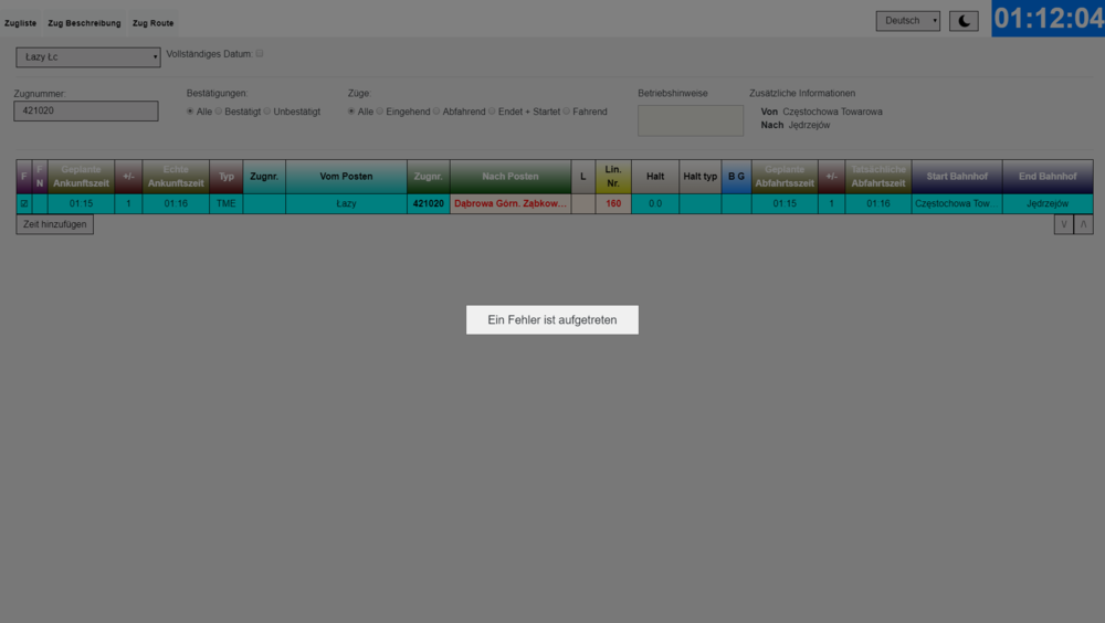 When I want to enter the transition times or other times in the timetable on the screen in the Łazy Łc signal box, I get the following error message: An error has occurred.
