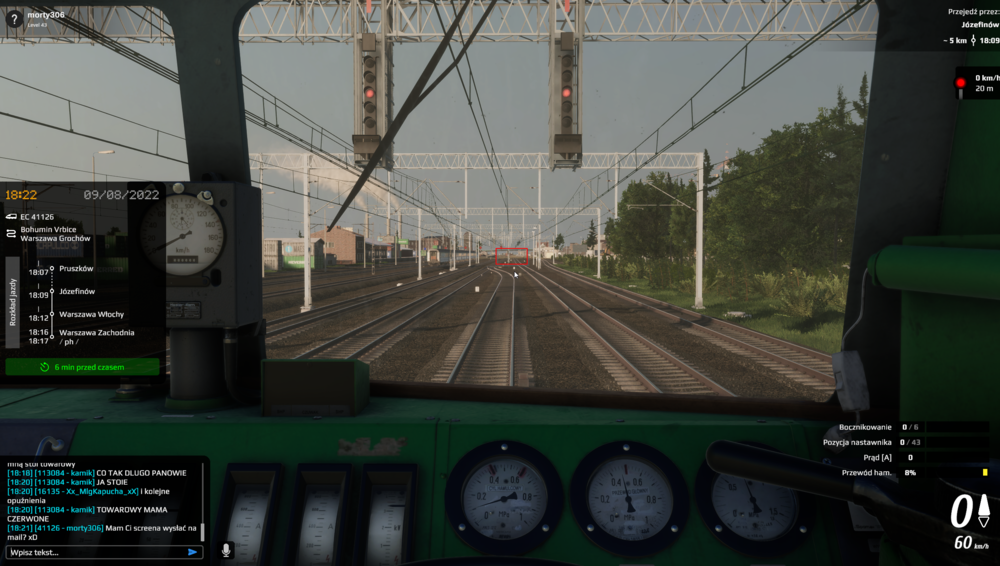2. Przed wjazdem na stację Józefinów zostałem skierowany na boczny tor z sygnałem "stój", przede mną stał towarowy (zaznaczony na screen w czerwonej ramce). Przez ponad 10 min nic się nie zmieniło, jeden z użytkowników posądził mnie o "trollowanie", więc dołączam zrzut z tej sytuacji. Użytkownik w pociągu poprzedzającym, zgłaszał, że również ma sygnał stój.