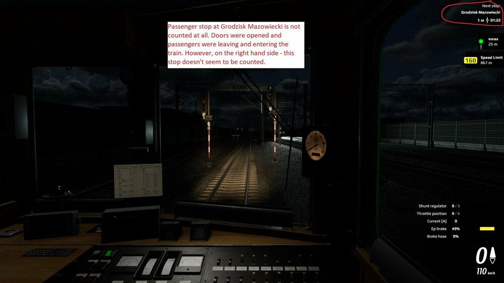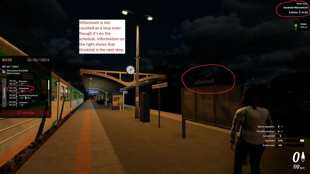 I noticed an issue at Milanówek station. It is on a schedule for passenger pickup / drop off - however the information on the right hand side shows that Grodzisk is the next stop.