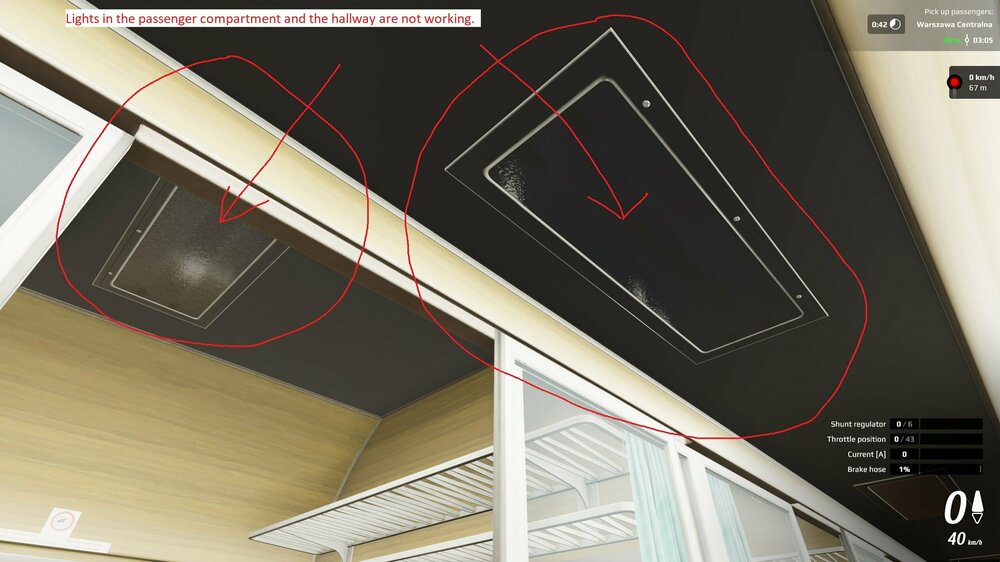 There are issues with the interior lights of 2 passenger wagons. More will be explained in the pictures below. One wagon one the left side (picture 1) is the newest one which was added recently, while one wagon on the right side (first class) has been in game a longer time. See descriptions in the pictures for further explanations.