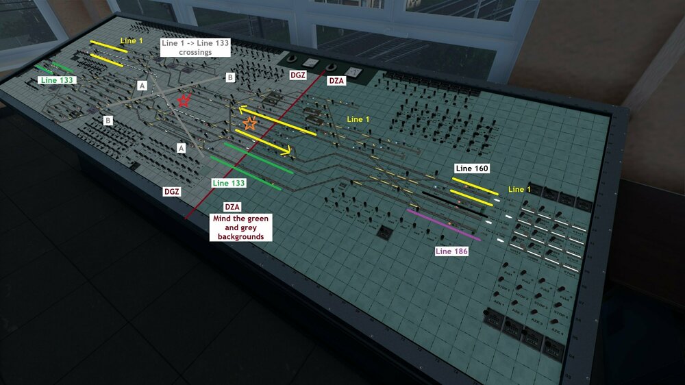Hello, for a long time, I was confused with the strange line numbers between the double post DGZ/DGZ DZA. Having a lot of fun to come back to dispatching DGZ, I would like to give a quick and dirty overview on where do the strange numbers come from. This is obviously a visual guide for newcommers. Veteran players won't find anything special in here. For tl;dr, simply have a glimpse at the marked dispatching table - it should be self-explanatory. All switches are 40 km/h. *** As mentioned before, the most confusing thing for me was the line 133 which you can see in EDR. I assumed it is the freight lane but where is the bloody line? Well, the big Eureka moment for me was noticing that the table is actually divided in two: greyish one for the main DGZ and green tiles for DGZ DZA. Seriously, I don't know how I haven't noticed it before. *** LINE 1 In the picture with the table, I have marked the Line 1 with yellow lines. This is the fast lane and it is pretty obvious. When trains arrive from Dąbrowa Górnicza from the west side via the yellow line, they usually continue eastards towards Łazy Łc also through the same line, Line 1. LINE 1 (DG) -> Line 186 (Łc) However, sometimes train switch from fast Line 1 to the slower one (freight and some regional trains). For those trains, EDR marks the transition to "Dąbr. Górn. Ząbk. DZA", so the next substation to the East, via Line 133 (see the attached EDR pictures, separately for DGZ and DZA). Line 133 is marked in the same picture with the green colour on the left. Trains from Dąbrowa Górnicza Huta Katowice arrive and depart through this line. Thus, in order to properly move the aforementioned trains through Dąbrowa Górnicza Ząbkowice (DGZ), we need to use the grey line "A" (marked). The train arrive on the left from the yellow line, go through the grey line "A" and continue on the green Line 133. I wrote "propely" just to emphasise how EDR (so also the people who created it) wants us to make it. There are, however, occasions where it is not always possible. For example, Line 133 is occupied by a train from Dąbrowa Górnicza Huta Katowice. In this case, we can also lead the train via Line 1 into DZA (the green background, right-hand side of the table) and make the transition on the big "X" junction (I really should have marked it as well). Another uncofortable case is for such transitions of freight trains, like 62xxxx. This train is supposed to go right after a freight train from DG Huta Katowice. They normally arrive at the same time and the 62xxxx needs to stop at the grey line "A". However, its tail will not leave Line 1 and it will be still occupied. Typically, there is no train following it from Dąbrowa Górnicza so it is not a problem. However, when there is a late train tailing it, we should probably put 62xxxx on some of the side tracks by the Line 1 and later make the transition on the "X" junction. Another observation: although the side tracks do look short on the table, I have yet to encounter a freight train that does not fit there. I am not saying all trains will alway fit there though as I don't consider myself a specialist. But I haven't seen such a case. LINE 1 (Łc) -> LINE 133 (DG Huta Katowice) This case is similar to the previous one. However, double check which line should the trains transition to 133. For fast trains, they usually continue on the Line 1 and change the lines after the platforms through the grey line "B". This spot, however, is the most dangerous spot in the game (in my humble opinion). The reason for that are semaphores marked in the picture with stars. When a train arrive from Łazy via the fast Line 1, they usually have travel with 110-120 km/h there. Our entry semaphore will give them 100 km/h limit and they merrily continue towards DZG. Then, they cross the semaphore marked with orange star. If we gave them permission to cross, it will warn them about the upcoming limit of 40 km/h but the semaphore has double arrows which means the next semaphore is located way closer than normally. And it is. If a train is not prepared, they will have troubles slowing to fourty and can derail. We had discussions about this spot in the Discord group and some people suggested transitioning the fast lanes early over the "X" junction in DZA. The others keep the orange star semaphore on red until they see people slow down and only then provide green. LINE 133 (DG Huta Katowice) -> LINE 186 (Łc) Trains go over a streight line with a high speed limit (100 km/h ?). If you don't have to, don't stop freight trains there. They will fly over your station. The opposite direction, Łc -> DG Huta Katowice, for freight trains is even easier since they mostly (always?) arrive from Łazy Łc over the Line 160. I don't know why it isn't called Line 186 in the other direction. However, for those trains, there is a straight line to go to Huta Katowice' with little to no problems. We need to request passage to Dąbrowa Górnicza Huta Katowice though. However, luckily we can simply press WBL without asking the bot. It will do the same for trains arriving from there. Don't forget to "KO" the line after their train arrive! *** I think that is all I wanted to share about the mighty Dąbrowa Górnicza Ząbkowice and the sister station, DZA. It is a lot of fun but can get hectic in rush hours or with queues of delayed trains. I hope this over-extended guide will help overcome the anxiety of taking over it for newcommers. Until next time chancellor
