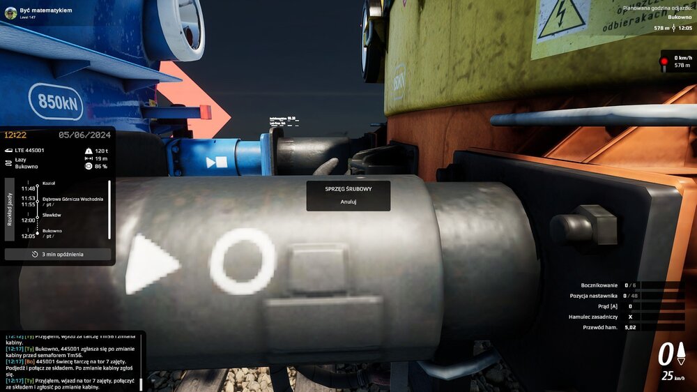 Bardzo fajny scenariusz. Misję 1 zrobiłem bez problemu. Za to trzy razy próbowałem zrobić Łazy Cargo i za każdym razem w Bukownie nie da się połączyć składów. Reflektory w siódemce są zapalone, nie da się do niej wejść. Stan jak na obrazku, nie ma żadnej opcji połączenia tylko informacja, że jest sprzęg śrubowy. Próbowałem odpiąć siódemkę od wagonów i zapiąć do Byka, też się nie da. Załączam obrazek i plik logu. Owszem, można spróbować pojechać od Bukowna, jest opcja, ale chciałbym zrobić scenariusz od początku do końca. SimRail_log_2025-09-14_12-30-00.txt