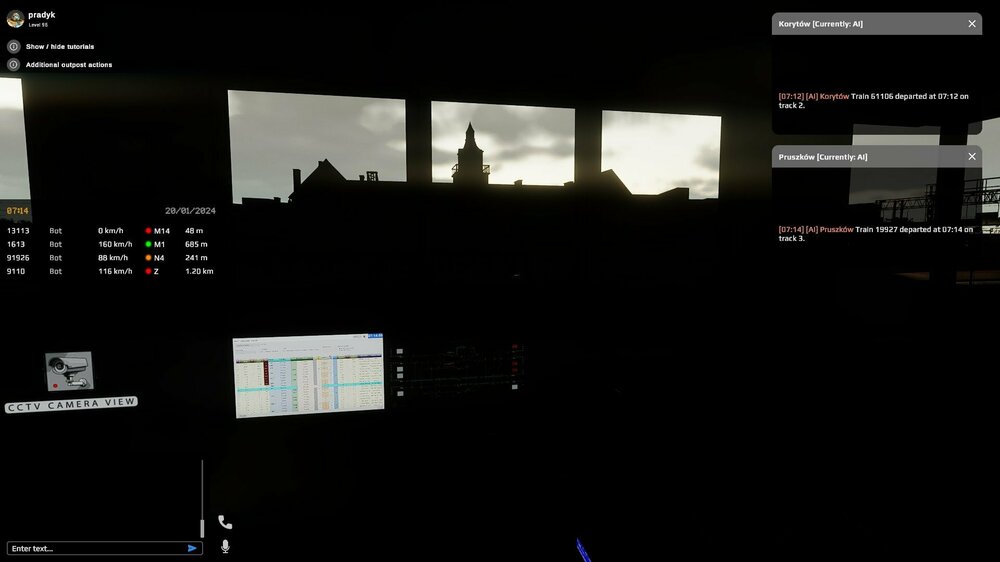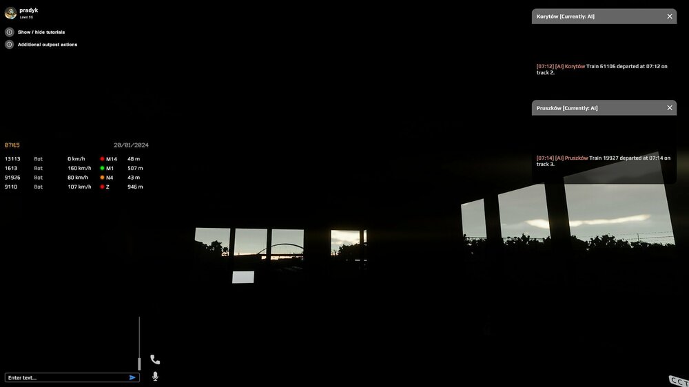 Had an issue with lighting condition at Grodzisk Mazowiecki at morning around 7 AM in the morning. Everything turned dark after looking out from timetable screen. Server - EN1; Date - 20/01/2024; Time - 07.14 UTC SimRail_log_2024-01-20_12-39-36.txt