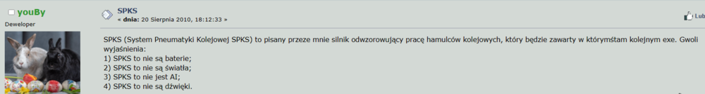 Na litość boską... przestań czytać wybiórczo. Wymagam zbyt wiele? Cytujesz coś selektywnie, wybierasz sobie to co pasuje do Twojej pseudologiki ubranej w beletrystykę i jeszcze używasz słowa polemika? To się nie dzieje... [swoją drogą to co zrobiłeś z cytatem mojej wypowiedzi to jest matactwo godne TVPIS w swoim najlepszym czasie] Siedzę sobie w tej tematyce od 2004 roku, nie używam jednak argumentu 20 letniej historii bo nie o to chodzi ale czy jeśli napiszę Ci, że jest staropolskie przysłowie "darowanemu koniowi w zęby się nie zagląda" i dodam, że Simrail nie jest darmowy to zrozumiesz, że płacąc możesz czegoś wymagać? Prościej byłoby Ci jednak pobrać ową MaSzynę i przeczytać pobieżnie ichnie forum żeby zrozumieć, że nawet darmowy projekt może funkcjonować na takiej umowie społecznej, która daje Ci przynajmniej wrażenie, iż nie jesteś tylko przelewem na firmowym rachunku bankowym.