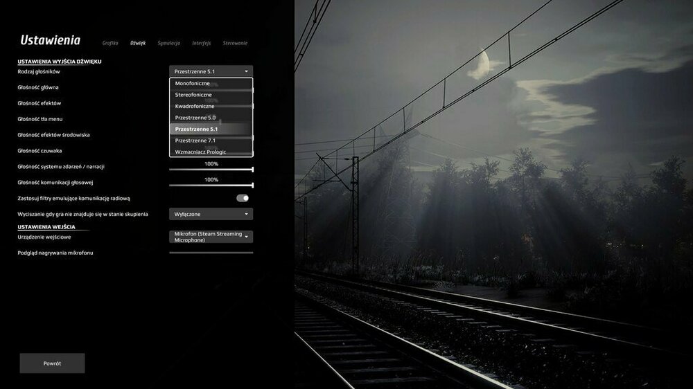 2. Witam wszystkich. Mam problem wymieniony w temacie. W Windows ustawione wyjście na głośniki 5.1 - Głośniki (2 — High Definition Audio Device, DXDIAG.txt w zał.). Przetestowane i działa. W innych grach działa. Tutaj, wybieram w opcjach 5.1 i cisza. Przestawię w systemie na stereo, w grze również i dźwięk jest. Dziękuję za wszelkie sugestie. SimRail_log_2024-05-01_14-43-00.txt SimRail_log_2024-05-01_14-40-15.txt SimRail_log_2024-05-01_14-44-35.txt DxDiag.txt