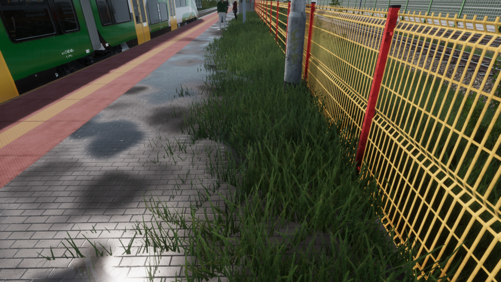 W przejściach nad peronami znajduje się roślinność i błędy tekstur, które widoczne są nad poręczami schodów: Rośliny w suficie i przy tylnej ścianie na suficie niebieski prostokąt: Tutaj oprócz roślinności znalazły się tak jak na pierwszym screenie prawdopodobnie błędy z teksturami na spodzie ścian widoczne nad poręczami: