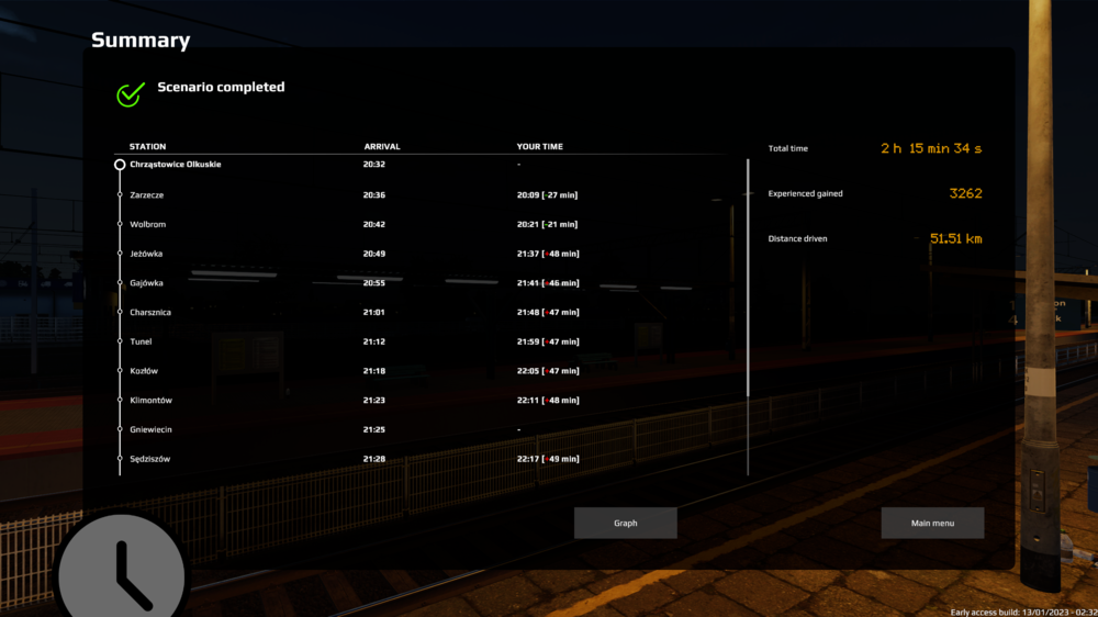While playing service number 421056, I was stopped by a red signal at Wolbrom for more than 40 minutes over the expected time I should have passed there. Server was "es1", time 21:26 CET. Update: Signal cleared while I was writing the report. Aprox 45 minutes late: I'm going to paste the end result screens blelow as they give additional info on times that might help with debugging: Stop at signal time in this screenshot: Signal cleared screenshot: