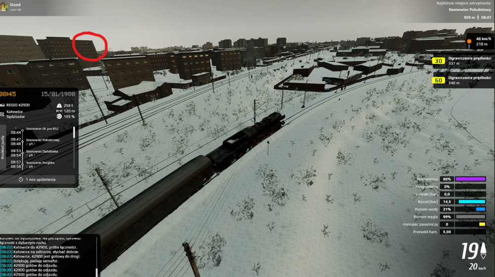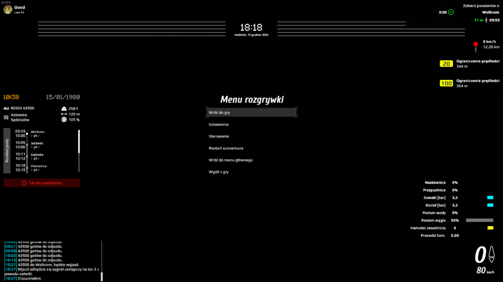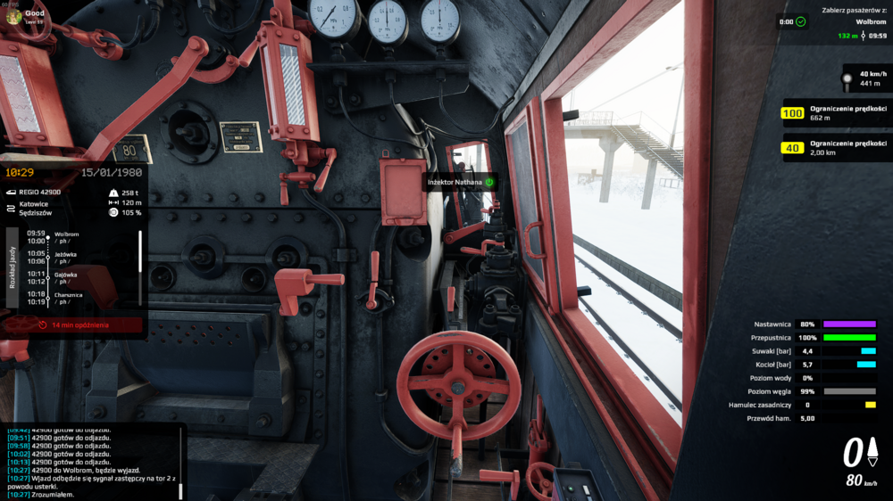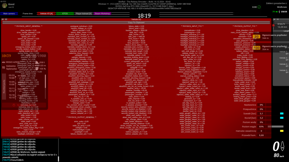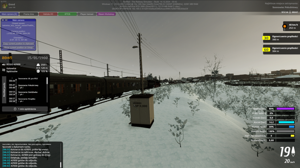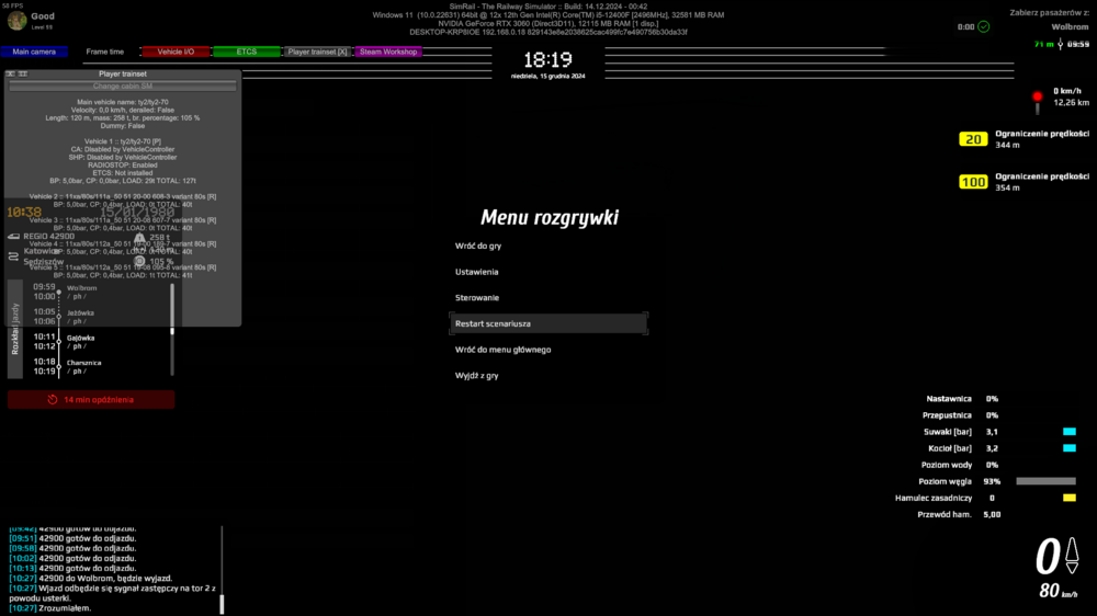 Więc, zaczęło się od tego, że po ustawieniu w parowozie Ty2 "Wysoki stan, zasilanie ciągłe" Pomocnik maszynisty, zamiast dolewać wody(było 2%, potem 0%), zaczął ją zasysać, więc uruchomiłem inżektory po swojej stronie(maszynisty), dalej nic, po wyłączeniu automatycznego Palacza i samemu uruchomienia każdego inżektora, oraz dania Inżektora Strubego na zasilanie wodą i odczekaniu 20 minut, przy każdym inżektorze włączonym, dalej było 0% napełnienia wody. Po czym po wejściu kamerą do Tendra, gra zatrzymała się w takim stanie, że wszystko zatrzymało się w miejscu i tylko przycisk "espace" działał, i były dźwięki zapętlone. SimRail_log_2024-12-15_13-46-00.txt