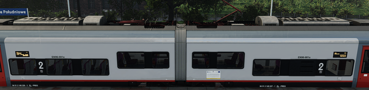 EN96-001 jak wiadomo ma dwa człony, w oby dwóch jest kabina i na każdym członie jest napisane z boku że to jest EN96-001. Po stronie kabiny ,,a" na członie jest napisane poprawnie, że to jest kabina ,,a", a w członie kabiny ,,b" jest napisane również ,,a". Z drugiej strony tego EZT jest analogicznie tak samo.