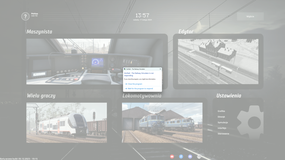 PS: Natomiast próba wyjścia z gry skończyła się tak (reakcja na wciśnięcie przycisku Wyjście): Jest NullReferenceException, ale też, co ciekawe, wygląda to jakby nachalnie chodził jakiś wirtualny dyżurny z multiplayer, podczas gdy ja grałem w single a potem siedziałem w menu: [2024-02-17 13:57:13]: Żyrardów - anulowano tworzenie przebiegu [2024-02-17 13:57:13]: Miechów - anulowano tworzenie przebiegu [2024-02-17 13:57:13]: Miechów - anulowano tworzenie przebiegu [2024-02-17 13:57:13]: Miechów - anulowano tworzenie przebiegu [2024-02-17 13:57:13]: Miechów - anulowano tworzenie przebiegu [2024-02-17 13:57:13]: Miechów - anulowano tworzenie przebiegu [2024-02-17 13:57:13]: Miechów - anulowano tworzenie przebiegu [2024-02-17 13:57:13]: Miechów - anulowano tworzenie przebiegu [2024-02-17 13:57:13]: Miechów - anulowano tworzenie przebiegu [2024-02-17 13:57:13]: Miechów - anulowano tworzenie przebiegu [2024-02-17 13:57:13]: Miechów - anulowano tworzenie przebiegu [2024-02-17 13:57:13]: Miechów - anulowano tworzenie przebiegu [2024-02-17 13:57:13]: Miechów - anulowano tworzenie przebiegu [2024-02-17 13:57:13]: Miechów - anulowano tworzenie przebiegu [2024-02-17 13:57:13]: Miechów - anulowano tworzenie przebiegu [2024-02-17 13:57:13]: Miechów - anulowano tworzenie przebiegu [2024-02-17 13:57:13]: Miechów - anulowano tworzenie przebiegu [2024-02-17 13:57:13]: Miechów - anulowano tworzenie przebiegu [2024-02-17 13:57:13]: Miechów - anulowano tworzenie przebiegu [2024-02-17 13:57:13]: Miechów - anulowano tworzenie przebiegu [2024-02-17 13:57:13]: Miechów - anulowano tworzenie przebiegu [2024-02-17 13:57:13]: Miechów - anulowano tworzenie przebiegu [2024-02-17 13:57:13]: Miechów - anulowano tworzenie przebiegu [2024-02-17 13:57:13]: Warszawa Gł.Tow.Sr18 - anulowano tworzenie przebiegu [2024-02-17 13:57:13]: Warszawa Gł.Tow.Sr18 - anulowano tworzenie przebiegu [2024-02-17 13:57:13]: Warszawa Gł.Tow.Sr18 - anulowano tworzenie przebiegu [2024-02-17 13:57:13]: Zamykanie serwera - OK [2024-02-17 13:57:13]: DISCONNECTED FROM SERVER [2024-02-17 13:57:13]: VirtualDispatcher stopped [2024-02-17 13:57:13]: L PlayerCleanup [2024-02-17 13:57:13]: Unloading 180 Unused Serialized files (Serialized files now loaded: 2) [2024-02-17 13:57:14]: Unloading 6531 unused Assets to reduce memory usage. Loaded Objects now: 917557. [2024-02-17 13:57:14]: Total: 508.007700 ms (FindLiveObjects: 94.372200 ms CreateObjectMapping: 34.508700 ms MarkObjects: 196.905200 ms DeleteObjects: 182.221200 ms) [2024-02-17 13:57:14]: Unloading 2 Unused Serialized files (Serialized files now loaded: 2) [2024-02-17 13:57:14]: TerrainDataDestroyer had to streamer set! [2024-02-17 13:57:14]: TerrainDataDestroyer had to streamer set! [2024-02-17 13:57:14]: TerrainDataDestroyer had to streamer set! [2024-02-17 13:57:14]: TerrainDataDestroyer had to streamer set! [2024-02-17 13:57:14]: TerrainDataDestroyer had to streamer set! [2024-02-17 13:57:14]: TerrainDataDestroyer had to streamer set! [2024-02-17 13:57:14]: TerrainDataDestroyer had to streamer set! [2024-02-17 13:57:14]: TerrainDataDestroyer had to streamer set! [2024-02-17 13:57:14]: TerrainDataDestroyer had to streamer set! [2024-02-17 13:57:14]: TerrainDataDestroyer had to streamer set! [2024-02-17 13:57:14]: TerrainDataDestroyer had to streamer set! [2024-02-17 13:57:14]: TerrainDataDestroyer had to streamer set! [2024-02-17 13:57:14]: TerrainDataDestroyer had to streamer set! [2024-02-17 13:57:14]: TerrainDataDestroyer had to streamer set! [2024-02-17 13:57:14]: TerrainDataDestroyer had to streamer set! [2024-02-17 13:57:14]: TerrainDataDestroyer had to streamer set! [2024-02-17 13:57:14]: TerrainDataDestroyer had to streamer set! [2024-02-17 13:57:14]: NullReferenceException: Object reference not set to an instance of an object. at UnityEngine.Object+MarshalledUnityObject.ThrowNullExceptionObjectImpl (System.Object obj) [0x00000] in <00000000000000000000000000000000>:0 at UnityEngine.Material.HasColor (System.String name) [0x00000] in <00000000000000000000000000000000>:0 at LightsEnablerController.OnDestroy () [0x00000] in <00000000000000000000000000000000>:0 [2024-02-17 13:57:14]: TerrainDataDestroyer had to streamer set! [2024-02-17 13:57:14]: TerrainDataDestroyer had to streamer set! [2024-02-17 13:57:14]: TerrainDataDestroyer had to streamer set! [2024-02-17 13:57:14]: TerrainDataDestroyer had to streamer set! [2024-02-17 13:57:14]: TerrainDataDestroyer had to streamer set! [2024-02-17 13:57:15]: TerrainDataDestroyer had to streamer set! [2024-02-17 13:57:15]: TerrainDataDestroyer had to streamer set! [2024-02-17 13:57:15]: TerrainDataDestroyer had to streamer set! [2024-02-17 13:57:15]: TerrainDataDestroyer had to streamer set! [2024-02-17 13:57:15]: TerrainDataDestroyer had to streamer set! [2024-02-17 13:57:15]: TerrainDataDestroyer had to streamer set! [2024-02-17 13:57:15]: TerrainDataDestroyer had to streamer set! [2024-02-17 13:57:15]: TerrainDataDestroyer had to streamer set! [2024-02-17 13:57:15]: TerrainDataDestroyer had to streamer set! [2024-02-17 13:57:15]: TerrainDataDestroyer had to streamer set! [2024-02-17 13:57:15]: TerrainDataDestroyer had to streamer set! [2024-02-17 13:57:15]: TerrainDataDestroyer had to streamer set! [2024-02-17 13:57:15]: TerrainDataDestroyer had to streamer set! [2024-02-17 13:57:15]: Controller not found in PlatformNetwork. platform name: peron1_Bedzin_Ksawera [2024-02-17 13:57:15]: TerrainDataDestroyer had to streamer set! [2024-02-17 13:57:15]: TerrainDataDestroyer had to streamer set! [2024-02-17 13:57:15]: UnloadTime: 784.209600 ms [2024-02-17 13:57:15]: GarbageCollector disposing of ComputeBuffer. Please use ComputeBuffer.Release() or .Dispose() to manually release the buffer. [2024-02-17 13:57:15]: GarbageCollector disposing of ComputeBuffer. Please use ComputeBuffer.Release() or .Dispose() to manually release the buffer. [2024-02-17 13:57:15]: GarbageCollector disposing of ComputeBuffer. Please