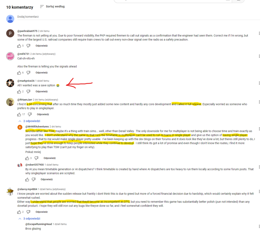 To jeszcze krótka rundka po youtubie. Po angielsku Simrail praktycznie nie istnieje. Od czasu debiutu praktycznie umarł i został zapomniany. Jest w zasadzie aż jeden film (mający więcej niż 3-cyfrową liczbę wyświetleń) o tym, że SimRail wyszedł z EA - i ma 2.5K wyświetleń... Warto poczytać te nieliczne komentarze co tam są: Z grubsza myślą to co my. Dodam, że to, że ludzie inni niż Polacy nie mają pojęcia co ten palacz na nich wykrzykuje to też jest niedoróbka. Powinny być co najmniej subtitlesy do tego po angielsku żeby wiedzieli co się dzieje. Po paru razach nawet zagraniczni by się nauczyli co który "dźwięk" znaczy "w tym dzikim języku" 😉 A tak jest lipa i nic nie rozumieją po co on gębę drze. A co się dzieje na polskim yt? Ano ciut więcej niż na CAŁYM POZOSTAŁYM ŚWIECIE, np. FanSim ma aż 10K wyświetleń. I proszę, tak oto wypadła premiera: 1. Pierwsze wrażenie wbija w ziemię: https://www.youtube.com/live/_sRou2KU2oI?t=596s 2. Podróże w czasie: https://www.youtube.com/live/_sRou2KU2oI?t=874s 3. Atmosfera: https://www.youtube.com/live/_sRou2KU2oI?t=1616s 4. Foch, i **uj: https://www.youtube.com/live/_sRou2KU2oI?t=2482s 5. Udana premiera: https://www.youtube.com/live/_sRou2KU2oI?t=2930s 6. Nowe zajedwabiste scenariusze: https://www.youtube.com/live/_sRou2KU2oI?t=4795s 7. Ludzie: https://www.youtube.com/live/_sRou2KU2oI?t=5909s 8. Pięć lat do tyłu: https://www.youtube.com/live/_sRou2KU2oI?t=6285s PS: Zawsze jeszcze mogło być gorzej...