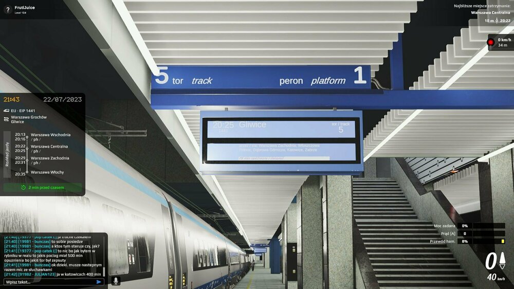 2. Witam Wczoraj(2.07) na serwerze PL2, jechałem pociągiem 1441. Z Warszawy Wschodniej, zostałem wypuszczony na tor lewy do stacji Warszawa Centralna, gdzie zostałem przyjęty na tor 5. Gra nie wykryła tego, że wjechałem w peron, przez co nie mogłem odbyć ph i otrzymałem ujemne punkty za przejazd bez zatrzymania. SimRail_log_2023-07-02_19-16-53.txt
