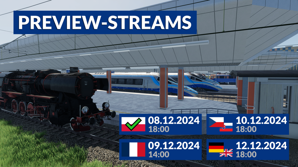 Hello everyone! 🙂 As you've probably already seen, today was the first preview stream in Polish from the streamer 'Mój Dzień w KaDe'. But it won't be the last. Here is the schedule for the next preview streams in the other languages: Tomorrow at 14:00 @Aurel will start the French stream. ➡️Link to the stream on Twitch: Twitch stream The next stream will be on Tuesday the 10th at 18:00. Our beta tester @TheFloxiCz will be streaming in Czech and Slovak. ➡️Link to the Youtube stream: Youtube stream Last but not least, my German colleague @Moooritz and I will be there for you on Thursday the 12th at 6pm. As you can see, there is no English only stream. For this reason, we will give you the opportunity to ask questions about the patch in English, and we will answer them as best we can and show them if necessary. We have a lot to show for you! ➡️We will also be streaming on Twitch at: Twitch stream ➡️If you want to join us on Discord, I will be streaming in addition on the official SimRail Discord server in the event stage.