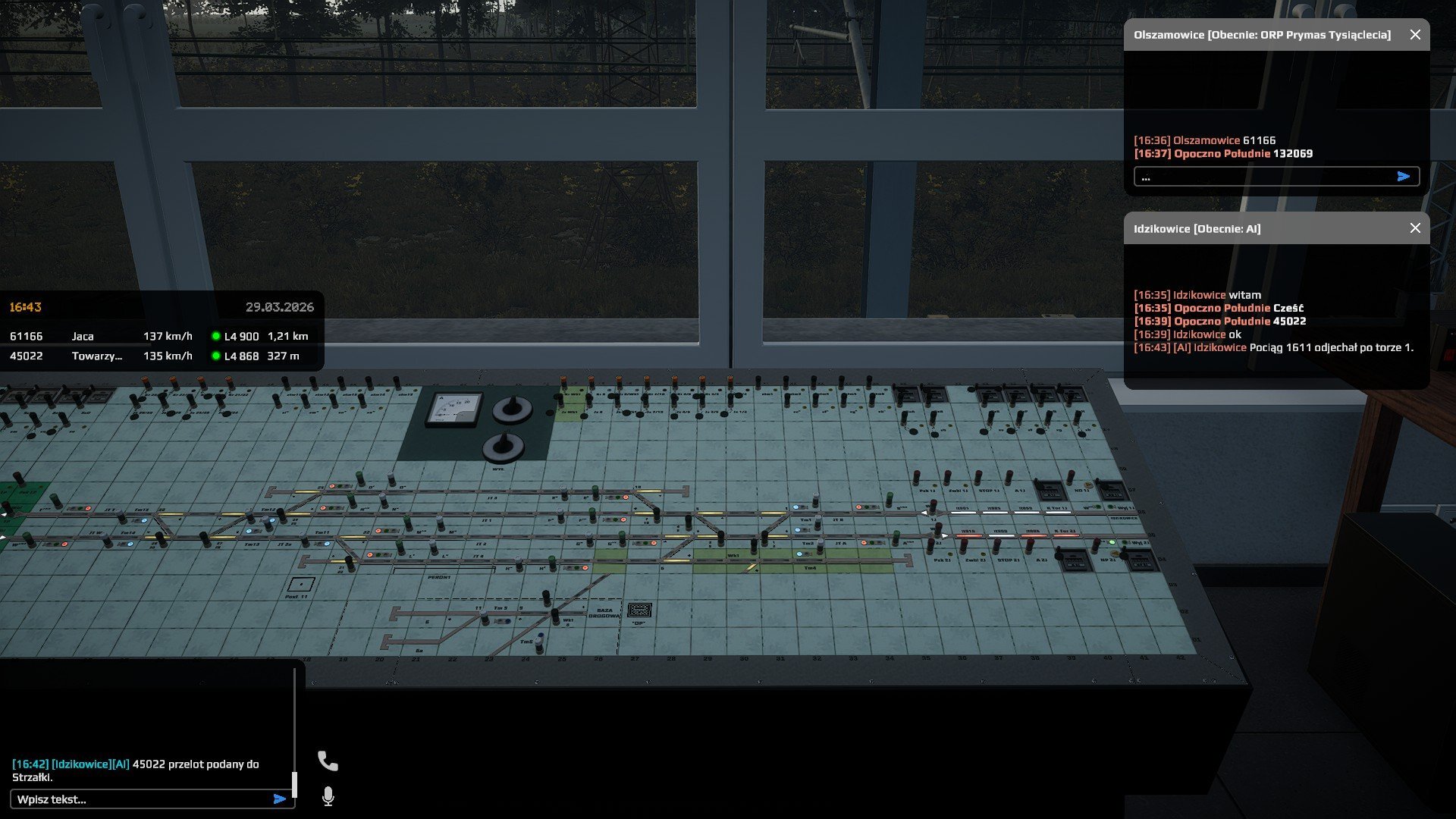 Mam propozycję, aby panel pociągów znajdujących się w pobliżu stacji pokazywał rzeczywisty kolor oraz stan (ciągłe światło lub miganie) następnego semafora przed każdym pociągiem. Dzięki temu moim zdaniem łatwiej i szybciej będzie wyłapać dyżurnemu, że nie ustawił jakiegoś semafora na przejazd, przykładowo zapomniał ustawić semafor wyjazdowy na jazdę. Teraz pociąg musi minąć pomarańczowy semafor, aby na HUDzie pojawił się czerwony kolor, gdzie pociąg często zaczyna już hamować. Obecnie są tam tylko dwa stany: zielony, jeżeli nie ma czerwonego lub czerwony, jeżeli pociąg ma przed sobą S-1. Przykład poniżej, pociąg 61166 ma przed sobą żółty semafor, gdyż jest tylko 1 wolny odstęp między nim i pociągiem 45022, ale na HUDzie dyżurnego widać, jakby miał zielony semafor. Jedyny przypadek jaki zauważyłem, że na HUDzie jest żółty symbol semafora, to gdy pociąg ma ograniczenie prędkości z powodu zmiany toru na rozjezdzie.