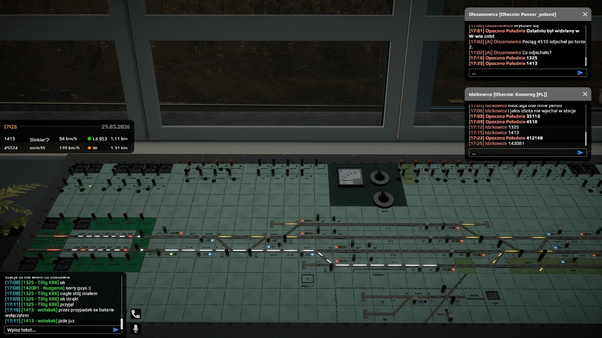 Wszedłem dzisiaj do w/w pociągu stojącego w Kozłowie. Serwer PL3 15.03.2026 ok godz. 18:40. Po wyjechaniu z Kozłowa ciągle miałem ograniczenie do 40. Po minięciu Tunelu to samo, mimo że minąłem znak ograniczenia do 110. Dane z lokomotywy poniżej. ** PHYSICS_INPUT_GENERAL ** drive_handle = 0,40 drive_handle_pressed = 0,00 scnd_handle = 0,00 speed_ctrl = 41,49 speed_ctrl_pressed = 0,00 main_brake = 2,00 local_brake = 0,00 third_brake = 0,00 emergency_brake_button = 0,00 security_system_button = 0,00 spring_brake_rq = 0,00 spring_brake_valve = 0,00 main_switch = 0,00 direction_rq = 1,00 battery_rq = 1,00 battery_rq_off = 0,00 pantograph_front_rq = 0,00 pantograph_back_rq = 0,00 pantograph_set_rq = 0,00 pantograph_set = 0,00 emergency_supply_button = 0,00 horn_signal = 0,00 active_cab = 1,00 light_pos = 5,00 brake_releaser = 0,00 unlock_brake_pipe = 0,00 assimilation_button = 0,00 lights_power = 0,00 washer = 0,00 wiper = 0,00 cablight = 2,00 pulpitlight = 0,00 instrumentlight = 0,00 sanding_button = 0,00 shunting_handle = 0,00 RadioStop = 0,00 radiostop_rq = 0,00 radiostop_test_rq = 0,00 radio_channel_set = 1,00 radio_enable_set = 1,00 radio_selective_call = 0,00 radio_button = 0,00 radio_noise = 0,00 radio_volume_set = 1,00 reset_crash = 0,00 error_code_ack = 0,00 error_code_rq = 0,00 emergency_brake_button_flag = -255,00 nope = 0,00 radio_channel_change = 0,00 headlight_individual = 0,00 endsignal_individual = 0,00 traction_voltage_rq = 0,00 failure_request = 0,00 failure_state_check = 0,00 friction_factor_simple_rq = 1,00 traindata_train_number_rq = 0,00 traindata_driver_number_rq = 0,00 traindata_train_length_rq = 0,00 traindata_train_mass_rq = 0,00 traindata_speed_rq = 0,00 traindata_braking_factor_rq = 0,00 traindata_brake_type_rq = 0,00 selective_door_select = 0,00 selective_door_request = 0,00 cablightB = 0,00 cablight_intensity = 0,00 pulpitlight_intensity = 1,00 instrumentlight_intensity = 0,00 emergency_pantographs = -255,00 etcs2023_release_brake = -1,00 etcs2023_service_brake = -1,00 etcs2023_emergency_brake = -1,00 etcs2023_shunting_ok = 0,00 etcs2023_shunting_reject = 0,00 etcs2023_ues_rq = 0,00 etcs2023_rma_rq = 0,00 etcs2023_text_message = 0,00 etcs2023_isolation_rq = 0,00 etcs2023_reset_all = 0,00 etcs2023_ack_button = 0,00 etcs2023_force_os_rq = 0,00 passengers_multipler_rq = -1,00 wire_ice_rq = 0,00 rt_speaker_pull_rq = 0,00 rt_speaker_press_rq = 0,00 change_cabin = 0,00 try_connect_driver_coupler = 0,00 try_disconnect_driver_coupler = 0,00 radmor_splitter_on = 0,00 radmor_splitter_cab = 0,00 radmor_adapter_on = 0,00 window_electric_heating = 0,00 window_airflow_heating = 0,00 ** PHYSICS_INPUT_E6ACT ** silent_mode_rq = 0,00 airtight_test_rq = 0,00 solo_drive_rq = -1,00 hvac_rq = 0,00 traction_change_rq = 0,00 ed_enable_rq = 0,00 abs_enable_rq = 0,00 tcu1_enable_rq = 0,00 tcu2_enable_rq = 0,00 motor1_enable_rq = 0,00 motor2_enable_rq = 0,00 motor3_enable_rq = 0,00 motor4_enable_rq = 0,00 motor5_enable_rq = 0,00 motor6_enable_rq = 0,00 power_limit_rq = 0,00 pantograph_front_cutoff_rq = 0,00 pantograph_rear_cutoff_rq = 0,00 shunting_mode_rq = 0,00 info_driver_number = 0,00 info_train_number = 0,00 info_consist_mass = 0,00 info_consist_length = 0,00 info_braking_mass_pct = 0,00 info_vmax = 0,00 speed_ctrl_rq = 0,00 distance_measure_rq = 0,00 traction_forbidden = 0,00 door_open = 0,00 fault_brakepipeleak_rq = 0,00 fault_opencircuitbreaker_rq = 0,00 fault_voltageloss_rq = 0,00 fault_nospeed_rq = 0,00 fault_nohorn_rq = 0,00 activation_handle = 2,00 pulpitlight_secondary = 0,00 electric_bus_button = 0,00 brakeregime = 1,00 pulpitlight2_intensity = 1,00 tdd_tab = 1,00 engine_room_door_open = 0,00 fuse_F03N_TCU1_Input = 0,00 fuse_F04N_TCU1_MC1_Input = 0,00 fuse_F06Y_Rezerwa_Input = 0,00 fuse_F07N_TCU2_Input = 0,00 fuse_F08N_TCU2_MC1_Input = 0,00 fuse_F13H_Nastawniki_Hamulca_Input = 0,00 fuse_F14U_Przetwornica_Input = 0,00 fuse_F15U_Przetwornica2_Input = 0,00 fuse_F17V_Wylacznik_Szybki_Input = 0,00 fuse_F18V_Sterownik_CID_Input = 0,00 fuse_F19P_PetlaEnergetyczna_Input = 0,00 fuse_F20B_Radiotelefon_Input = 0,00 fuse_F21B_Rejestrator_Input = 0,00 fuse_F22B_SHP_Input = 0,00 fuse_F23H_Sterownik_Hamulca_Input = 0,00 fuse_F24H_Elektrozawor_Hamulca_Input = 0,00 fuse_F92Y_Zasilanie_Sterownika_Przeciwposlizgu_Input = 0,00 fuse_F93Y_Zasilanie_Elektroniki_PSM1_Input = 0,00 fuse_F94Y_Zasilanie_Elektroniki_PSM2_Input = 0,00 fuse_F01U_Zabezpieczenie_Przed_Stycznikiem_Baterii_Input = 0,00 fuse_F11B_Syrena_Ton_Wysoki_Input = 0,00 fuse_F12B_Syrena_Ton_Niski_Input = 0,00 fuse_F23B_Interfejs_SHP_Input = 0,00 fuse_F31P_Przelaczniki_Cisnieniowe_Input = 0,00 fuse_F32P_Czujniki_Na_Podwoziu_Input = 0,00 fuse_F33D_Sterownik_Kabina1_Input = 0,00 fuse_F34D_Sterownik_Kabina2_Input = 0,00 fuse_F35D_Sterownik_RNN_Modul1_Input = 0,00 fuse_F36D_Sterownik_RNN_Modul2_Input = 0,00 fuse_F37D_Sterownik_RNN_Modul3_Input = 0,00 fuse_F38D_Sterownik_RNN_Modul4_Input = 0,00 fuse_F39D_Sterownik_RNN_Zasilania_Input = 0,00 fuse_F40D_Sterownik_RWN_Zasilanie_LEM_Input = 0,00 fuse_F41Y_Ladowarka_USB_GPS_Operatora_Input = 0,00 fuse_F42S_Obwody_Pomocnicze_Sprezarki_Nr1_Input = 0,00 fuse_F43S_Obwody_Pomocnicze_Sprezarki_Nr2_Input = 0,00 fuse_F44Y_Rejestrator_Monitoring_Input = 0,00 fuse_F45L_Oswietlenie_Input = 0,00 fuse_F46L_Oswietlenie_Input = 0,00 fuse_F47P_Odlaczniki_Pantografow_Input = 0,00 fuse_F48Y_Wycieraczki_Maszynisty_Input = 0,00 fuse_F49Y_Wycieraczki_Pomocnika_Input = 0,00 fuse_F50B_System_PPoz_Input = 0,00 fuse_F51B_Rezerwa_Input = 0,00 fuse_F52B_Rezerwa_Input = 0,00 fuse_F53B_Rezerwa_Input = 0,00 fuse_F54B_Rezerwa_Input = 0,00 fuse_F55Y_Sterownik_HVAC_Input = 0,00 fuse_F56Y_Wentylator_Skraplacza_Input = 0,00 fuse_F57Y_Wentylator_Parownika_Input = 0,00 fuse_F58Y_Sterownik_HVAC_2_Input = 0,00 fuse_F59Y_Wentylator_Skraplacza_2_Input = 0,00 fuse_F60Y_Wentylator_Parownika_2_Input = 0,00 fuse_F10_Zasilanie_Podnozkow_Maszynisty_Input = 0,00 shp_test = 0,00 powerpack_heating_rq = 0,00 pneumatic_d14_backupmode_rq =