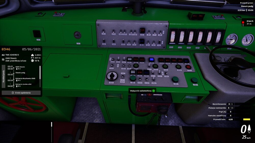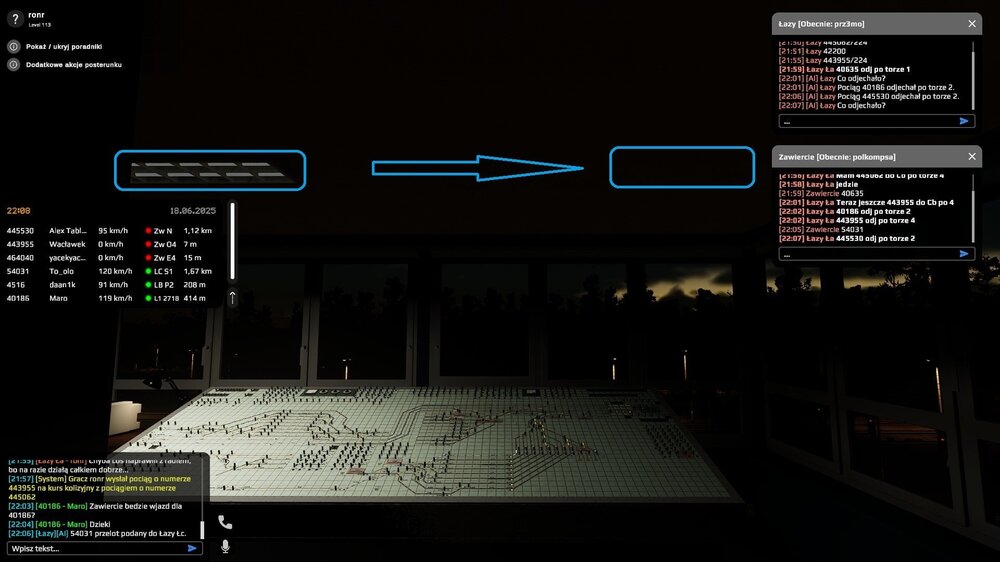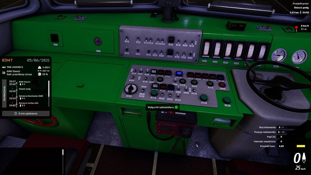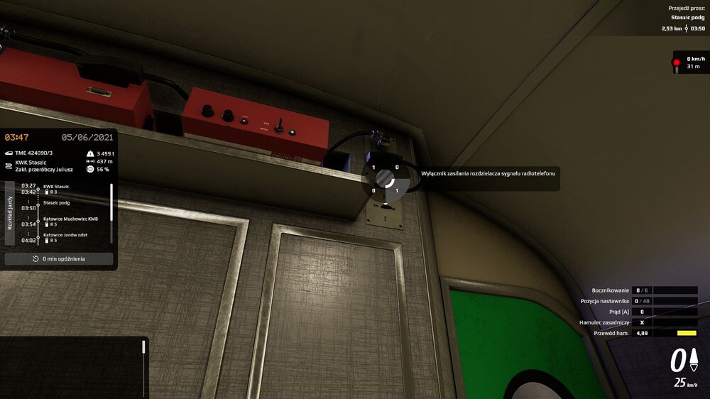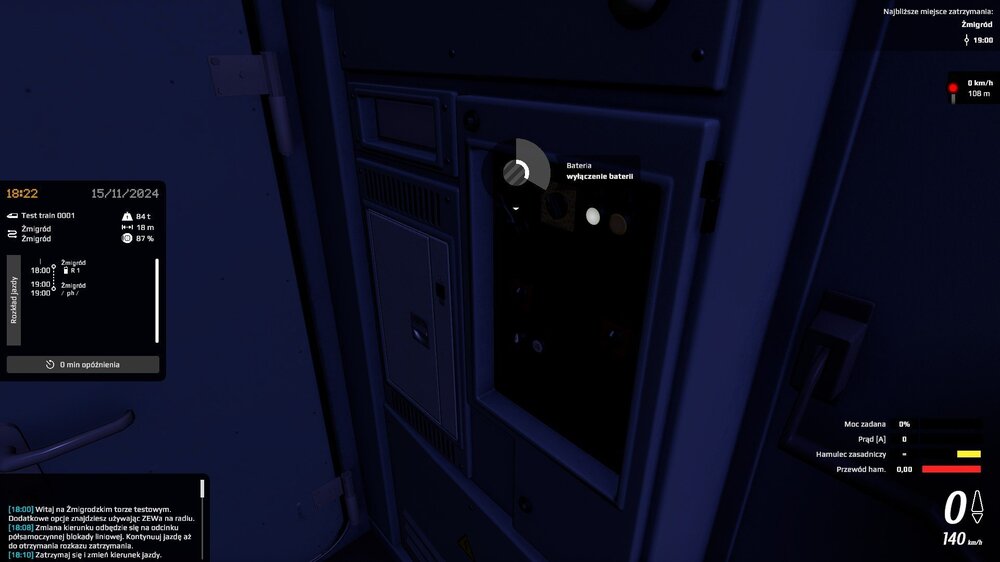 Nie wiem czy tak jest w rzeczywistości, ale poniższe elementy nie przestają działać po odłączeniu akumulatora: - światła przednie i tylne, - oświetlenie kabiny, - ekrany w kabinie, - podświetlenie przycisku wyboru kierunku jazdy. Systemy, które przestają działać po wyłączeniu akumulatora: - radio, - oświetlenie pulpitu, - po zmianie typu świateł zewnętrznych te nie zmieniają się. Po włączeniu akumulatora wcześniejsza zmiana trybu zostanie teraz zastosowana. SimRail_log_2025-05-05_22-38-45.txt
