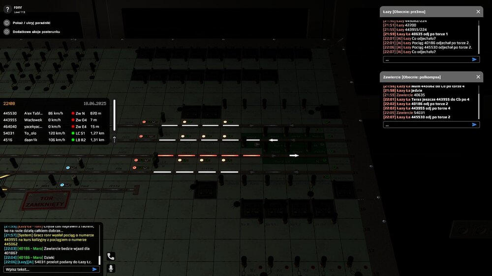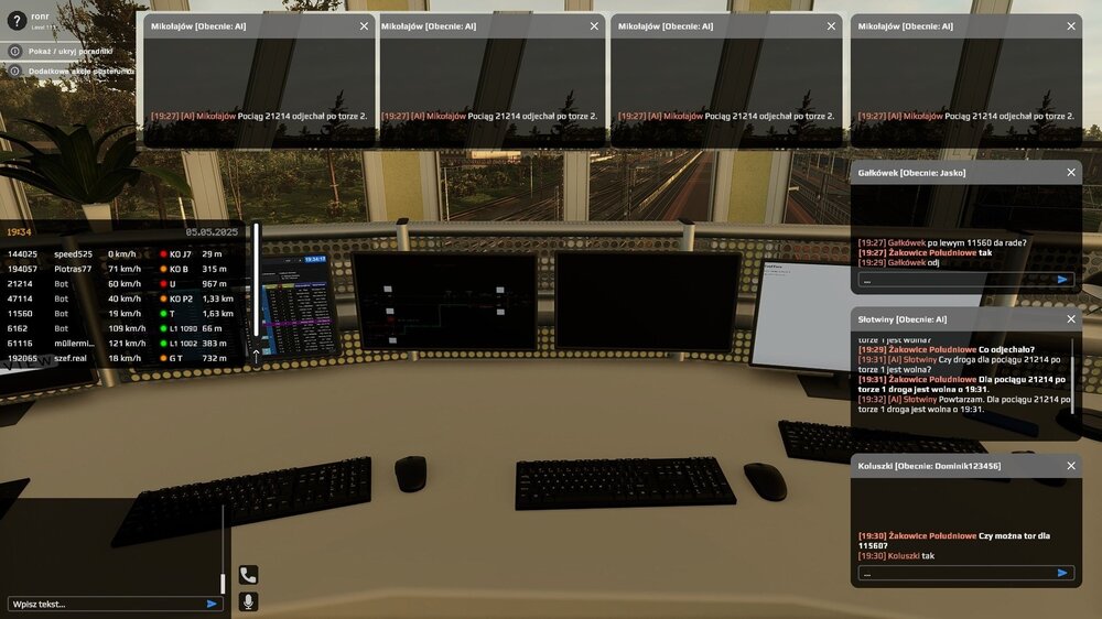 Przy n-tej próbie przejścia scenariusza od innego gracza zauważyłem, że po zmianie kabiny B na A i włączeniu radia, nie zapala się lampka kontrolna. Poszedłem sprawdzić czy nie zapomniałem wyłączyć w kabinie B i było włączone. Po wyłączeniu w B wróciłem do A, włączyłem radio A i ponowie było to samo. Powtórzyło się to kilka razy. PS Włączona była tylko sprężarka 2, ale to nie powinno mieć wpływu. Załączone zdjęcia ukazują w kolejności: 1 Włączone radio A i brak lampki na radiu. 2 Włączone radio i włączoną lampkę w kabinie B. W pewnym momencie było słychać "trzaski". 3 Wyłączenie radia B. 4 Radio A wyłączone 5 Radio A włączone, rak lampki na radiu. 6 Pozycja wybieraka radia A 7 Pozycja włączona 8 Radio B ponownie włączone po włączeniu radia A na zdjęciu 5. SimRail_log_2025-05-04_17-33-15.txt