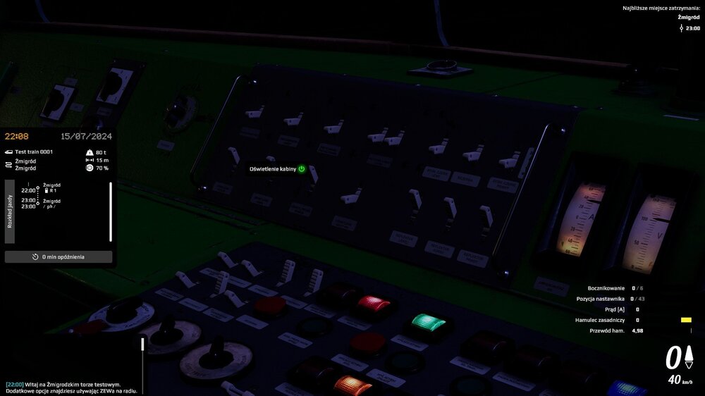 W scenariuszu Żmigród po zmianie kabiny na B zauważyłem, że włączniki oświetlenia w kabinie B włączają oświetlenie w kabinie A. Nie dotyczy to oświetlenia wskaźników. Pierwsze zdjęcie przedstawia pozycję włączników oświetlenia w kabinie B. Drugie zdjęcie przedstawia lokomotywę od strony kabiny A.