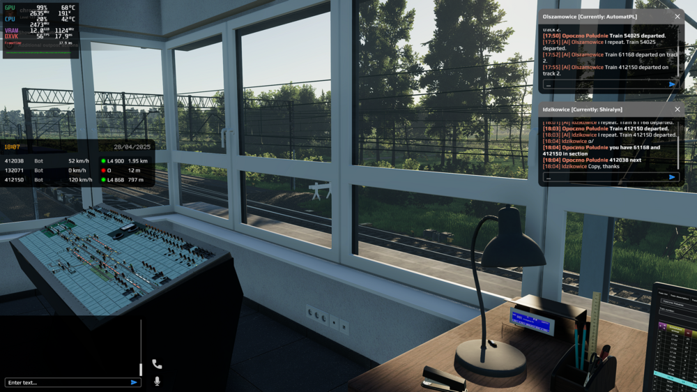 Just the relevant end of the log: [2025-02-12 21:40:13]: RailStockResourceManager colling down prefab Prefabs/Vehicles/201E/ET22-256 [2025-02-12 21:40:13]: RailStockResourceManager colling down prefab Prefabs/Vehicles/408S/408S [2025-02-12 21:40:19]: [SRK] Ustawienie semafora 1952_KG_P101 bez pozwolenia i bez pociągu [2025-02-12 21:40:19]: [SRK] Kraków Główny - Polecenie ustawienia przebiegu: 1952_KG_P101 -> z_1952_KG_3ab-> z_1952_KG_3cd-> z_1952_KG_8ab-> z_1952_KG_8cd-> z_1952_KG_9-> z_1952_KG_320-> z_1952_KG_321-> z_1952_KG_337 -> 1952_KG_U11 Pociągowy True [2025-02-12 21:40:36]: Call pressed in trainset-Player. Call type: 3, Step: KGA, ch1 [2025-02-12 21:40:49]: [SRK] Kraków Główny - Polecenie ustawienia przebiegu: 5465_KGA_L -> 5465_KGA_Tm229 Manewrowy - inicjalizacja [2025-02-12 21:40:49]: [SRK] Kraków Główny 5465_KGA_L - Rezerwacja przebiegu. False [2025-02-12 21:40:49]: [SRK] Początek: True, Kontroler is NULL: False, DozwPrzeb: False, !środek: True [2025-02-12 21:40:49]: [SRK] Spełnienie flag dla początku: True [2025-02-12 21:40:49]: [SRK] Flagi - basic: StanPodstawowy, route: Utwierdzenie, blocking: StanPodstawowy [2025-02-12 21:40:49]: [SRK] Kraków Główny - Brak możliwości rezerwacji przebiegu dla jednego z elementów [2025-02-12 21:40:49]: [SRK] Kraków Główny - Polecenie ustawienia przebiegu: 5465_KGA_L -> 5465_KGA_Tm229 Manewrowy False [2025-02-12 21:40:55]: [SRK] Kraków Główny - Rozwiązanie przebiegu: 1952_KG_T7 -> z_1952_KG_7ab-> z_1952_KG_7ab-> z_1952_KG_4ab -> 5465_KGA_L Pociągowy [2025-02-12 21:40:59]: [SRK] Kraków Główny - Polecenie ustawienia przebiegu: 5465_KGA_L -> 5465_KGA_Tm229 Manewrowy - inicjalizacja [2025-02-12 21:41:01]: [SRK] Ustawienie semafora 5465_KGA_L bez pozwolenia i bez pociągu [2025-02-12 21:41:01]: [SRK] Kraków Główny - Polecenie ustawienia przebiegu: 5465_KGA_L -> 5465_KGA_Tm229 Manewrowy True [2025-02-12 21:41:01]: [SRK] Polecenie ustawienia przebiegu: 5465_KGA_Tm229 -> t32623kps wywołało wyjątek. Object reference not set to an instance of an object. at TrafficControl.Interlock.Posterunek.RealizacjaPoleceniaDwuargumentowego (Orders polecenie, System.String początek, System.String koniec, System.Collections.Generic.List`1[T] l, System.Byte[] isdr, System.Byte[] id_polecenia) [0x00000] in <00000000000000000000000000000000>:0 at TrafficControl.Interlock.LAN.NetworkSerwer+<>c__DisplayClass42_0.<HandleMessage>b__8 () [0x00000] in <00000000000000000000000000000000>:0 at System.Runtime.CompilerServices.AsyncTaskMethodBuilder.Start[TStateMachine] (TStateMachine& stateMachine) [0x00000] in <00000000000000000000000000000000>:0 at TrafficControl.Interlock.LAN.NetworkSerwer+<>c__DisplayClass42_0.<HandleMessage>b__8 () [0x00000] in <00000000000000000000000000000000>:0 at System.Threading.Tasks.Task`1[TResult].InnerInvoke () [0x00000] in <00000000000000000000000000000000>:0 at System.Threading.Tasks.Task.Execute () [0x00000] in <00000000000000000000000000000000>:0 at System.Threading.ExecutionContext.RunInternal (System.Threading.ExecutionContext executionContext, System.Threading.ContextCallback callback, System.Object state, System.Boolean preserveSyncCtx) [0x00000] in <00000000000000000000000000000000>:0 at System.Threading.Tasks.Task.ExecuteWithThreadLocal (System.Threading.Tasks.Task& currentTaskSlot) [0x00000] in <00000000000000000000000000000000>:0 at System.Threading.Tasks.Task.ExecuteEntry (System.Boolean bPreventDoubleExecution) [0x00000] in <00000000000000000000000000000000>:0 at System.Threading.ThreadPoolWorkQueue.Dispatch () [0x00000] in <00000000000000000000000000000000>:0 [2025-02-12 21:41:01]: [SRK] Polecenie do przebiegu: 5465_KGA_Tm229 przebiegManewrowy wywołało wyjątek. Trace: System.NullReferenceException: Object reference not set to an instance of an object. at TrafficControl.Interlock.Posterunek+<>c.<RealizacjaPoleceniaDwuargumentowego>b__67_3 (PrzebiegPojedynczySRK l) [0x00000] in <00000000000000000000000000000000>:0 at TrafficControl.Interlock.Posterunek.RealizacjaPoleceniaDwuargumentowego (Orders polecenie, System.String początek, System.String koniec, System.Collections.Generic.List`1[T] l, System.Byte[] isdr, System.Byte[] id_polecenia) [0x00000] in <00000000000000000000000000000000>:0 at TrafficControl.Interlock.LAN.NetworkSerwer+<>c__DisplayClass42_0.<HandleMessage>b__8 () [0x00000] in <00000000000000000000000000000000>:0 at System.Runtime.CompilerServices.AsyncTaskMethodBuilder.Start[TStateMachine] (TStateMachine& stateMachine) [0x00000] in <00000000000000000000000000000000>:0 at TrafficControl.Interlock.LAN.NetworkSerwer+<>c__DisplayClass42_0.<HandleMessage>b__8 () [0x00000] in <00000000000000000000000000000000>:0 at System.Threading.Tasks.Task`1[TResult].InnerInvoke () [0x00000] in <00000000000000000000000000000000>:0 at System.Threading.Tasks.Task.Execute () [0x00000] in <00000000000000000000000000000000>:0 at System.Threading.ExecutionContext.RunInternal (System.Threading.ExecutionContext executionContext, System.Threading.ContextCallback callback, System.Object state, System.Boolean preserveSyncCtx) [0x00000] in <00000000000000000000000000000000>:0 at System.Threading.Tasks.Task.ExecuteWithThreadLocal (System.Threading.Tasks.Task& currentTaskSlot) [0x00000] in <00000000000000000000000000000000>:0 at System.Threading.Tasks.Task.ExecuteEntry (System.Boolean bPreventDoubleExecution) [0x00000] in <00000000000000000000000000000000>:0 at System.Threading.ThreadPoolWorkQueue.Dispatch () [0x00000] in <00000000000000000000000000000000>:0 [2025-02-12 21:41:12]: U tunel_krakow_terrain_x113_z-37 [2025-02-12 21:41:12]: L tunel_krakow_terrain_x103_z-36 [2025-02-12 21:41:12]: U tunel_krakow_terrain_x112_z-39 [2025-02-12 21:41:12]: L tunel_krakow_terrain_x103_z-37 [2025-02-12 21:41:12]: U tunel_krakow_terrain_x111_z-40 [2025-02-12 21:41:12]: L tunel_krakow_terrain_x103_z-35 [2025-02-12 21:41:13]: U tunel_krakow_terrain_x109_z-41 [2025-02-12 21:41:13]: L tunel_krakow_terrain_x104_z-33 [2025-02-12 21:41