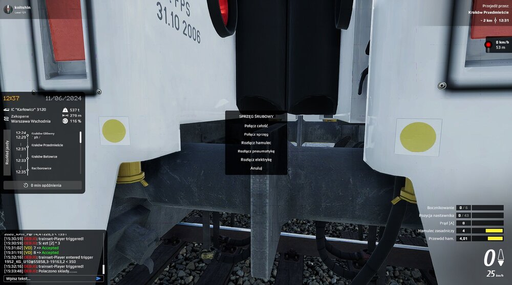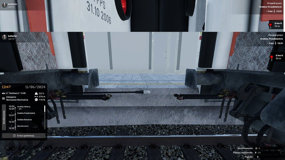 Chciałem sprawdzić jak działa przejęcie składu przez bota po bezczynności gracza. Stałem na stacji z otwartymi drzwiami, po minucie braku aktywności bot ruszył (miał S2) ale nie zamknął drzwi, punkty karne cały czas się naliczały, także kiedy przejąłem kontrolę i zatrzymałem się na następnej stacji (printscreen), nawet po zamknięciu drzwi i ponownym otwarciu. Przestały się naliczać dopiero po odjeździe. Z innej beczki: W Katowicach (AI) cały czas pociągi towarowe mają pierwszeństwo nad osobowymi.
