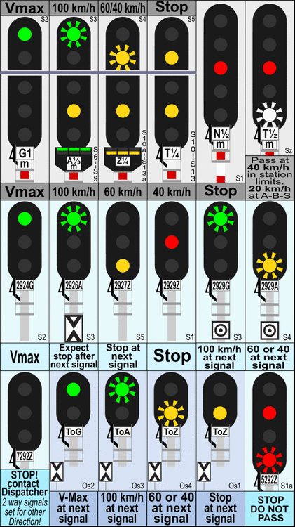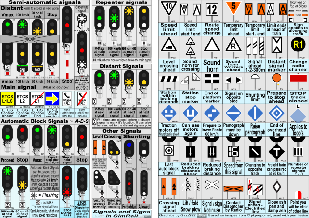 Originally posted in the Play test part of the forum, posting here for the new players who have just bought SimRail, This is also the place i will post the latest version... which is : V1.8.1. I've seen quite a few posts from people on here and discord, asking what some signal or sign means that they have seen when driving in SimRail, Especially hard to understand can be the Semi-automatic signal aspects, as different combo's of lights mean different things for the signal you are at and the next one ahead. So i decided to make a guide showing the meaning of the various signal aspects and signs likely to be seen when driving, and i thought others may find this handy. The image above is a low quality preview, please print out the high quality version in the .zip file attached The zip file attached at the bottom contains a portrait and landscape version of the whole guide as seen above, saved in both .png and .pdf formats. You can print the guide out or display it on a phone / tablet / 2nd monitor, allowing you to look up what that signal or sign was telling you that you just zoomed passed whilst driving in SimRail The idea of the landscape guide (shown above) is so you can print it out on a sheet of A4 paper and fold it in half, giving you a handy A5 sized guide with the signals on one side and signs on the other side. Or keep it full sized in either landscape or portrait if you wish. The .png versions of the full guide are saved at 300 DPI, good enough to print at ~A3 size, i believe the .pdf versions are good for A4 size printing. If you can, laminating the print out will make it last almost forever (or until mistakes are spotted and i need to re-release the files) When printing, it might help to set your print settings to 'fit to page keeping aspect ratio' and 'centre on the page' if that's an option. Alternatively, you can display the guide on a phone or tablet (this is how i use it) If using a tablet, 2nd screen or large phone, simply displaying the whole guide may be fine, but for a normal sized 'tall and skinny screen' smart phone, it may be too small to read unless you zoom and scroll about the picture. So i have also made 3 condensed views of the guide arranged for better viewing on a phone screen, you can flip / swipe between the 3 images/pages on your phone and view them in a format that fills a 'typical' smartphone screen as much as possible, however this version does not have the info panels telling you things like passing an automatic block signal at red etc that the full guide has, so i would recommend reading the full sized guide first to see a few explanations about some of the signs and signal types. The phone images are saved at 150 DPI to reduce their file sizes, so older phones don't have take their time rendering the image fully each time you flip between the pages. I have included the ETCS signs on the full and phone sized versions, and semaphore signals on the phone version, the latter was mostly to fill space from arranging the signals across 2 phone sized pages, but i have seen a mechanical shunting signal 'M1' in SimRail already, and the ETCS signs are in place along the line, but we don't drive the trains in ETCS mode yet. The 'Printing or Displaying the pictures' Read Me file explains how to 'use' the images with more detail / waffle. The 'Understanding the guide ' Read Me file has some info on a few Polish railway rules and how to read the semi-automatic signals. There is also a folder called 'Textless guides for translation' inside this folder are the 2 full guides plus the phone sized ones with the graphics but empty text boxes, the idea being people can add the text below the pictures in their native language then share the translated guide with others (If you translate the guide , could you please post it in this thread) You can open the .png versions in an image editor, then add you translated text over the empty boxes, or use a PDF editor and you should be able to type directly into the text boxes. Big thanks to jmluengor for the idea of a pdf version to edit, and he has posted the Spanish version a few posts below this one. ---------------------- Sorry for the poor quality of the 2 photo's below, i will update them with better versions when i can borrow my girlfriends much newer phone camera. And below is an animated .gif showing the 3 pages that make up the phone sized pages showing the signals and signs as if you were flipping between them. The small print: I have drawn all the signal and signs myself in Inkscape as vectors, but i based the signals and signs on other peoples work, listed below: The signal aspect images are based on the ones on the polish railway signals Wikipedia page : https://en.wikipedia.org/wiki/Polish_railway_signalling That page has a creative commons 3 license (CC BY-SA 3.0) : https://creativecommons.org/licenses/by-sa/3.0/ Which means i am allowed to re-mix and distribute the content as long as i reference the page i based my version on, and link to the relevant CC3 license. The sign images are based on the ones shown on : http://pkprepo.net/wskazniki-kolejowe-pkp-epoka-vc/ That page has a creative commons 4 license (CC BY-NC-ND 4.0) : https://creativecommons.org/licenses/by-nc-nd/4.0/ Which means that i needed permission to "Re-mix, Transform or Build Upon'' the content, i have been granted that permission by E-Mail from the author of the website. Change log for V1.8.1: Corrected a miss labeled signal (Osp 1) that should be Osp 2. All content available in .png and ,pdf formats. Added ETCS signs and the GSM-R signs. Text less guides for translating are available in full guide landscape and portrait format, and the 3 pages that make up the condensed phones version. 1913687062_SignsandSignalsinSimRailGuideV1.8.1.zip