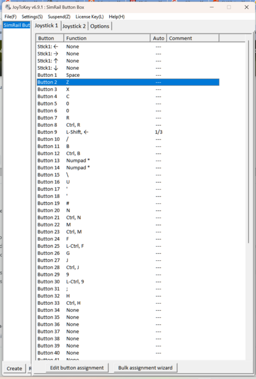 Can I use a button box? I have problems using a mouseGazz292 replied to betoule's topic in General Discussion [Singleplayer] Yes you can... i use 3D printed switch and button boxes as well as controllers to drive my favourite trains in SimRail... for me it's about immersion, i hate using a keyboard or mouse to drive a train. Can your button box be programmed to send keyboard keys? If so, then that's all you need to do, just program each button on it to send the relevant keyboard keys that you use to operate the controls in the trains (quite a few keybinds need assigning in the controls menu of SimRail first, a lot of things you operate with the mouse can be triggered with keybinds) If the button box only sends joystick buttons, then you can use a program like JoytoKey to change the joystick buttons into keyboard key presses... i use this myself for my home made button boxes that i use a joystick button board inside them. you basically just press each button on the button box with JoytoKey open, and select the input that shows up and set that to the relevant keyboard key that SimRail uses for that control in the trains. Below is a screenshot of the JoytoKey assignment i set up for my EU07 train switch panel :