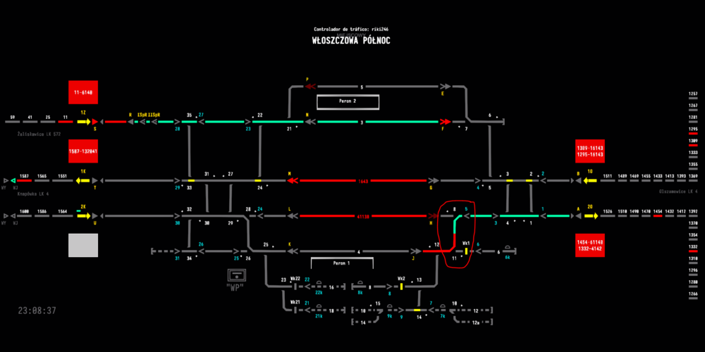 Train 41138 had route until Olszamowice but when the train reach H signal it stopped and was blocked. Then, i canceled the 41138's route and let pass the other train (31142) waiting at Peron 1. 31142 moved into the switch normaly, but in the middle of the switch, the train suddlenly stopped and it was blocked too. I don't know if it's a bug or i made a mistake.
