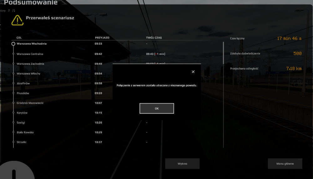 Zaczynam nowy scenariusz z Warszawy do Katowic w Warszawie miałem dość często spadki fps ale gdy zatrzymałem się na dworcu w Warszawie Zachodniej gra się całkowicie zacięła pojawił się komunikat że simrail nie odpowiada i rozłączyło mnie z serwera SimRail_log_2023-01-23_19-52-38.txt