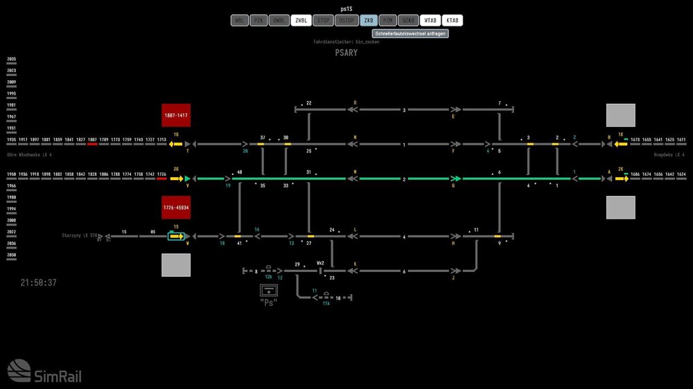 As you can see in the screenshot, Psary has the "ZKB"-command for switching block-directions with Starzyny. If this command is applied to send a train to Starzyny, it was reported to me that on the relay-pannel the request for changing the direction is visible, but the Pzk-Button would not work to acknowledge the request. After switching ZKB off and using ZWBL -> WBL, everything works normal again.