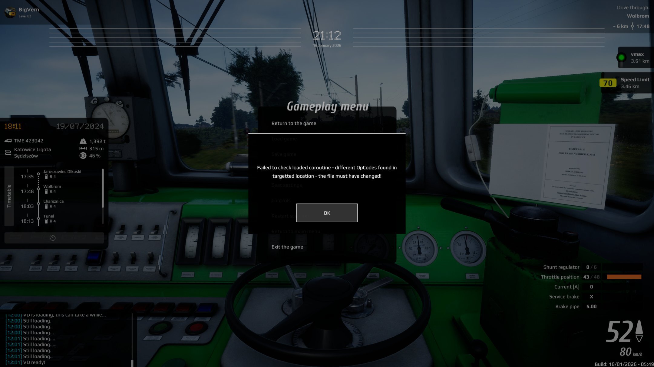 BigVern Posted Sunday at 05:47 PM Author Posted Sunday at 05:47 PM (edited) 4 hours ago, Jasonic said: There seems to be a problem with the saves after one of the last beta updates. Yes I have submitted a bug report but it has yet to appear in the Bug Forum. The VD is loading oaky but once the train loads you get a pop up box with random error message on top of the pause menu, once you click it get thrown back to the main menu. Hopefully the guys will be back at work tomorrow and get it sorted but rather frustrating when we hoped it would be possible to really get going in SP mode. Edited Sunday at 05:50 PM by BigVern